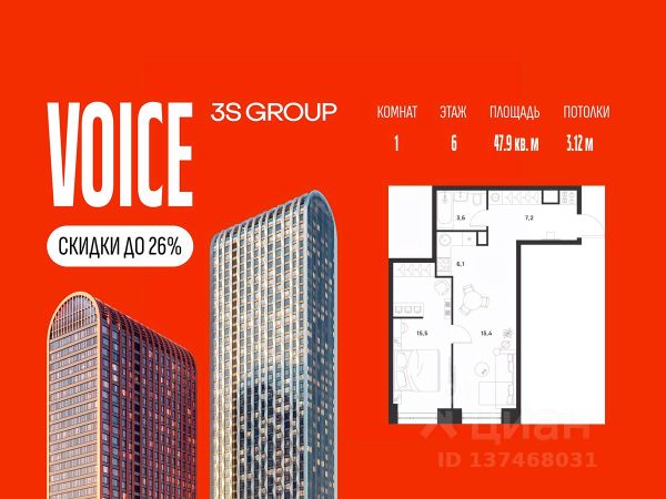 Ипотека от 3,5% на весь срок. Дополнительная скидка в офисе продаж! Продается уютная 1-комн. квартира площадью 36,7 кв.м на 25 этаже жилого комплекса бизнес-класса Voice Towers от 3S Group. Общая площадь: 36,7 кв.м., жилая: 22,7 кв.м., площадь кухни-гостиной: 18,4 кв.м., высокие потолки: 3,12 м., санузел совмещенный. О проекте: Voice. Высокие стандарты жизни Мы уверены, что высокие идеалы неизменно помогают достигать высот. Создавая Voice, мы ориентировались на людей с высокими требованиями к качеству и безупречным вкусом. Башни жилого комплекса, сочетают элегантную форму с динамичной геометрией фасадов, устремляются ввысь и отвечают самым высоким стандартам строительства. Технологичность, воплощенная в архитектуре - это ваш, собственный Voice. Преимущества локации Близость к метро Текстильщики, БКЛ и МЦК Новохохловская (10 мин) Рядом природный заповедник и конно-спортивная база Кузьминки-Люблино Будущее окружение Проект Южный порт - Текстильщики с деловым центром Сити-2 Небоскребы высотой до 300м Культурный центр с амфитеатром Променад вдоль Москвы-реки и яхт-клуб Архитектура Проект от Архитектурной мастерской Алексея Ильина Две перпендикулярные башни с арочными вершинами Высокая башня: светло-серый металл Низкая башня: терракотовая керамика Благоустройство Внешняя зона: парковки, магазины, кафе Внутренний двор: закрытая территория с озеленением Шумозащитный экран Сезонное озеленение Встречи на высоте Гранд-лобби высотой 8м Дизайнерская мебель Умные скоростные лифты Услуги Детский центр с игровой зоной Фитнес-студия для жителей Продам 1-комнатную квартиру с отделкой от застройщика в районе Текстильщики в Москве.
