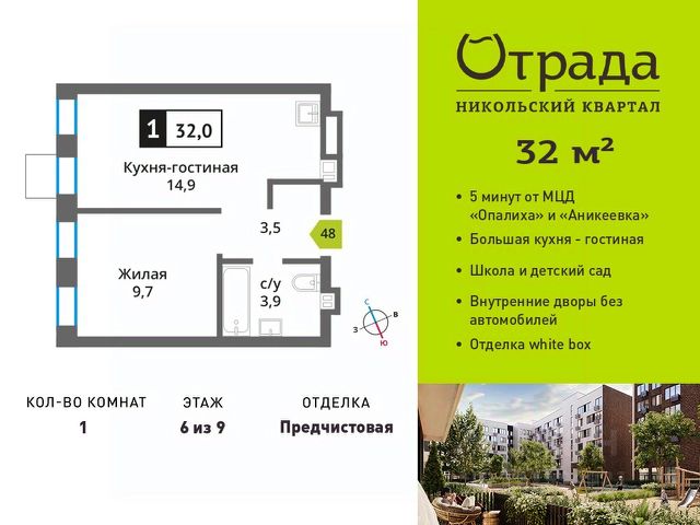 Агентам не звонить. Продается 1-комнатная квартира на 3 этаже от застройщика. Общая площадь 30,2 кв.м. На выбор представлены 3 вида дизайнерской отделки с использованием качественных материалов. Высота потолков 3 м. "Коллекция" это камерный среднеэтажный жилой комплекс бизнес-класса в престижном экологически чистом районе Подмосковья. Прекрасная экология и живописная природа, отсутствие промышленных зон и вредных предприятий. В проекте планируется строительство 5 корпусов средней этажностью (4-8 этажей) с террасами и угловыми окнами, строительство собственной инфраструктуры: три детских сада, школа, поликлиника, физкультурно-оздоровительный комплекс. Жителям будут доступны машино-места в подземном паркинге, кладовые помещения. Ввод в эксплуатацию 3 кв. 2028г. Развитая инфраструктура: Детские площадки будут выполнены в природных материалах, игровые комплексы с бизибордами, развивающие игровые установки для игр с песком. Спортивная инфраструктура: столы для настольного тенниса, тренажеры, гимнастический комплекс. В пешей доступности находятся парк Дружба, загородный клуб "Moscow Country Club", парк имени Карбышева. Это располагает к приятным прогулкам и спокойному отдыху жителей комплекса. Транспортная доступность: 13 км от МКАД, 14 минут до МЦД-2 Нахабино, 26 минут до метро "Митино", 30 минут до метро "Пятницкое шоссе". В ближайшей перспективе - расширение местной дорожной сети и запуск новых маршрутов до ж/д станций и станций метро.