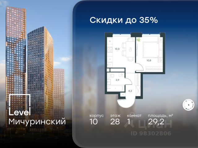 Цена указана с учётом скидки при 100%-й оплате, несубсидированной ипотеке, рассрочке (кроме программы "Рассрочка 0%"). В жилом квартале, расположенном на границе с природным заказником "Долина реки Очаковки", продаётся 1-комнатная квартира площадью 39.00 кв.м с отделкой white box. Квартира расположена на 3 этаже 24-этажного корпуса 11 в жилом комплексе бизнес-класса Level Мичуринский (компания Level Group/Левел групп). Отличная транспортная доступность - 10 мин. пешком до станции метро "Мичуринский проспект" - 15 мин. пешком до станции метро "Аминьевская" - 7 мин. на авто до МКАД - 10 мин. на авто до ТТК - 15 мин. на авто до Москва-Сити Продуманный архитектурный проект - Выразительная архитектура от известных бюро: корпуса 1-6 - СПИЧ, корпуса 7-13 - Borisov Architects; - Из окон открываются живописные виды на парки, Москва-Сити и МГУ; - Высокие потолки до 6,35 м; - Стильные лобби с окнами в пол и высокими потолками до 4,7 м; - С каждого этажа дома на лифте можно спуститься в подземный отапливаемый паркинг. Расположение Level Мичуринский строится в одном из самых зеленых районов Москвы - Очаково-Матвеевское. Этот уголок столицы идеален для поддержания здорового образа жизни. В шаговой доступности от проекта находятся заказник "Долина реки Очаковки" - 1 мин. пешком и Очаковский парк - 7 мин. пешком. На велосипеде можно добраться до таких парков, как "Событие", парк Олимпийской деревни, парк 50-летия Октября и парк Школьников. В 15-минутной доступности на авто расположено более 30 детских садов (из них 14 в пешей доступности), 32 школы (из них 13 в пешей доступности) и 14 вузов. В ближайшем окружении работает более 25 медицинских учреждений, 11 спортивных клубов и 22 продуктовых супермаркета. Внутренняя инфраструктура На территории жилого комплекса строится три детских сада и школа. На первых этажах домов откроется супермаркет, фитнес-центр, ресторан, кафе и другие сервисы. Подземные этажи займут паркинги: трехуровневые в этапах 1 и 2, одноуровневый в этапах 3 и 4. Преимущества проекта - 4,5 га благоустроенной территории с видовым мостом, уличным кинотеатром, зонами для тихого отдыха, работы, воркаута, площадки для петанка, футбола, настольного тенниса и пляжного волейбола; - Дизайнерские лобби с панорамным видом на двор, мойками для лап животных и комфортными зонами ожидания. - Безопасность жителей: круглосуточное видеонаблюдение всех зон общего пользования (лобби, лифты, паркинги, детские площадки), система контроля доступа, управление видеодомофоном через мобильное приложение, единый ключ доступа на территорию жилого комплекса. - Технологии и комфорт: высокоскоростной Wi-Fi в лобби и на придомовой территории, автоматическая система контроля и учета ресурсов, абонентская связь с консьержем, распознавание номеров автомобилей при въезде/выезде в/из паркинга. Продам 1-комнатную квартиру в новостройке с отделкой рядом с метро Мичуринский проспект.