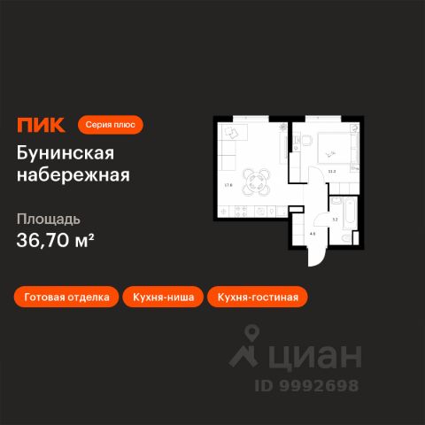В жилом комплексе, расположенном по соседству с ландшафтным парком "Южное Бутово", продается 1-комнатная квартира площадью 37.70 кв. м. с отделкой. Квартира расположена на 3 этаже 2 корпуса в жилом квартале комфорт-класса "Новые Смыслы" (ГК Unikey/Юникей). Доступная и удобная локация: - 10 минут ходьбы до станции метро "Потапово". - 25 минут ходьбы до станции метро "Бунинская аллея". - 15 минут на авто до Калужского шоссе. - 20 минут на авто до МКАД. - 30 минут на машине до аэропортов "Внуково" и "Остафьево". Продуманный архитектурный проект: - Разноуровневые секции с эстетичные башнями и контрастными цветовыми сочетаниями, напоминающими башни в Сити. - Сказочные виды из окон на современный район столицы. - Авторские планировки с потолками в 3 метра, просторными кухнями-гостиными и мастер-спальнями. - Комфортные бесплатные общественные пространства. - Подземный паркинг с прямым доступом на лифте. - Настоящий лес с живописными пейзажами и прудом прямо во дворе. Расположение Комплекс "Новые Смыслы" расположится в благоприятном районе Новой Москвы - Коммунарка. Зеленое окружение, богатая инфраструктура развивающегося района - все это сформирует особое пространство для комфортной жизни, наполненной смыслом. 10 минут на велосипеде - и вы в ландшафтном парке "Южное Бутово" или сквере у Потаповских прудов. Чуть дальше расположен Бутовский лесопарк. В окружении "Новых Смыслов" вы найдете все необходимые социальные объекты. В двух шагах от дома находится 5 школ, более десятка детских садов, секции для занятий малышей и подростков, частные клиники, супермаркеты, рестораны, студии красоты и фитнес-центры. За 12 минут на авто вы доберетесь до ледовой арены, комплекса "Спорт Станция" и спа-центра "Termoland". Внутренняя инфраструктура Для жителей "Новых Смыслов" будут созданы бесплатные общественные пространства: - Деловая гостиная с эстетичным коворкингом и переговорными. - Гостиная для души и тела, включающая фитнес-зону с тренажерами и пространства для стретчинга, йоги и медитаций. - Гостиная детства, где дети будут играть и развиваться под присмотром тьютора. - Кино-гостиная - кинотеатр на крыше одного из домов, предлагающий разнообразную программу. - Прачечная, работающая только для жильцов. Вместе с корпусами комплекса на территории запланировано строительство детского сада. На первых этажах корпусов откроются кофейни, пекарни, сервисы быта и пункты доставки. Благоустройство Чтобы отдохнуть от суеты города, достаточно выйти во двор: здесь раскинулся настоящий лес с живописными пейзажами. В тени деревьев жителей ждут пруд с мостиком и беседкой на берегу, тихие прогулочные аллеи, спортивная площадка и зоны для занятий йогой и бадминтоном на свежем воздухе. Юных жителей порадуют современные детские площадки, жукарий и специальное пространство для подвижных игр. Безопасность на территории гарантирована: двор огорожен от машин и оснащен камерами видеонаблюдения.