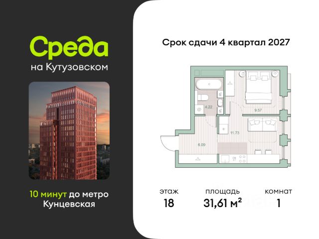 О квартире Продаётся однокомнатная квартира общей площадью 33.98 кв. м. с отделкой на выбор: черновая, White Box. Квартира на 16 этаже корпуса 5 в жилом комплексе бизнес-класса "Среда на Кутузовском". До метро "Кунцевская" 10 минут пешком. Исторический зелёный район "Среда на Кутузовском" строится в Кунцево - историческом и экологически чистом районе Москвы. Здесь нет крупных производств, много лесных массивов и роза ветров, которая обеспечивает приток чистого воздуха. Район наполнен жизнью и уже развит: много детских садов и школ, поликлиники, магазины, кафе, спортивные объекты, парки. - 10 минут пешком до станции метро "Кунцевская". - 5-8 минут на машине до Кутузовского проспекта и Можайского шоссе и 10-15 минут до Рублёвского и МКАД. - 15 минут езды до Крылатских холмов, Суворовского парка и заказника "Долина реки Сетунь". Акции и спецпредложения - Выгода 12%: если внести 100% оплату или оформить семейную ипотеку под 6%. Действует до 13 апреля. - Низкие ставки по ипотеке: 0,1% в первый год или 0,11% в первые два года кредита. - Трейд-ин от "Среды": можно обменять свою текущую квартиру на новую. - Ипотека для семей с детьми: если ребёнку до 7 лет, предлагаем льготную ставку 3,5% О жилом комплексе "Среда на Кутузовском" - новый квартал с башнями от 12 до 44 этажей, окружённый лесными массивами и историческими усадьбами старой Москвы. Во внутреннем дворе есть водоём, многоуровневые зоны с детскими и спортивными площадками, коворкинг на свежем воздухе и локации для уединённого отдыха. Особенности - Архитектура с многослойными фасадами. - Квартиры с террасами и мастер-спальнями. - Окна в пол на всех этажах. - Общественные лаунж-гостиные. - Собственный ландшафтный парк во дворе. - Зоны барбекю и площадки для отдыха у воды. - Умный подземный паркинг. - Стрит-ритейл на первых этажах.