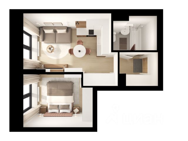 - Финишная (чистовая) отделка: светлые стены с обоями под покраску, ламинат, натяжные потолки, установленные межкомнатные двери, окна с низкими подоконниками, а также полностью оборудованные санузлы с сантехникой и плиткой.