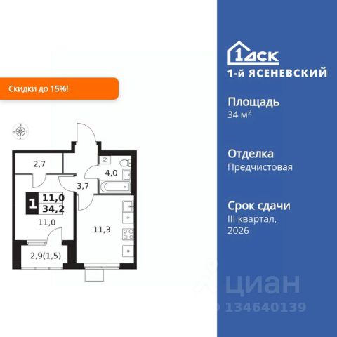 Прямая продажа от застройщика! Жилой Комплекс класса Комфорт Плюс. Продаётся 1-к квартира номер 9 общей площадью 35.7 кв.м. на 2-м этаже 8 этажного здания. Отделка Whitebox. Цена с учётом скидки. Особенности квартиры: - Квартиры рядом с метро - м. Корниловская 9 мин пешком - 63 га лесопарка за окнами - Школа c it-кластером и бассейном. 2 детских сада - Линейная планировка - максимальная функциональность и удобство. - Можно оборудовать рабочее место - комфорт для работы и учёбы. - Ниша под шкаф - компактное и удобное место для вещей. - Лоджия - уютное место для отдыха и тишины. Квартира с предчистовой отделкой (White box). Вам не придется заниматься черновыми и трудоёмкими работы, а чистовую отделку и дизайн - сделайте на свой вкус. Информация о комплексе: В жилом комплексе комфорт-плюс класса "1-го Ясеневского" доступны преимущества двух стилей жизни. Ведь в пешей доступности метро, школа с 25-метровым бассейном и IT-кластером и при этом целых 63 га благоустроенного Троицкого лесопарка под окнами, где так приятно дышать свежим воздухом и слушать пение птиц. Собственная закрытая территория "1-го Ясеневского" представляет собой уютный оазис. Здесь и зеленый освещенный бульвар для прогулок, система велодорожек, маленькая городская площадь, кафе, пекарни и кофе поинты. А еще дворы без машин и многоэтажная парковка. Изюминка территории - фруктовые деревья во дворах и городские сады. "1-й Ясеневский" - всего в 1 км от МКАД, на территории новой Москвы. Жилой комплекс, где есть все необходимое для современного человека. Транспортная доступность: До метро "Корниловская" - 12 минут пешком До метро "Тютчевская" - 25 минут пешком До метро "Теплый стан" - 10 минут на транспорте До метро "Ольховая" - 30 минут на общественном транспорте Личный автотранспорт: Выезд на Калужское шоссе - 500 м МКАД - 1 км Внутренняя инфраструктура: ЖК "1-й Ясеневский" можно назвать идеальным местом для жизни семьи с детьми. Здесь буквально за домом находится Троицкий лесопарк - излюбленное место прогулок молодых родителей. А во внутренних дворах под детские площадки выделены специальные зоны. Они оборудованы всем, что нужно для счастливого детства: современными и максимально безопасными качелями, песочницами и лазалками. Оборудование и игровые сценарии на детских площадках спроектированы вместе с командой детских психологов для правильного развития ребенка и для повышения их интереса. Также рядом с домом два детских садика, один из которых уже построен и школа на 1100 мест. Школу по праву можно назвать образцовым учебным заведением. В ней закладываются основы успешного будущего. Здесь есть класс робототехники, IT-кластер, 25-метровый бассейн и прекрасно оборудованные спортзалы.