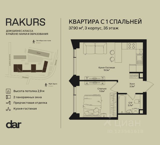 Продаётся 1-комнатная квартира 37.10 м² в жилом комплексе Ракурс. Квартиру отличают панорамное остекление, потолки 2,9 м, улучшенная шумо и воздухоизоляция. Дом сдаётся в 1 квартале 2028 года, продажи проходят через эскроусчета. Подземный паркинг, коворкинг, закрытая благоустроенная территория с фонтаном и артобъектами. Гибкие условия покупки. Rakurs — место, в котором жизнь приглашает к исследованию. Концепция проекта knowledge-centric среда, которая выражается здесь в образе жизни: • атмосфере интеллектуальной среды, • доступности образования, • фокусе на возможности для развития. RAKURS разместился в районе науки и окружен исследовательскими институтами и образовательными учреждениями, при этом на территории построена своя школа с уникальной концепцией. Расположенный на пересечении улиц Маршала Бирюзова и Берзарина, недалеко от станций метро "Октябрьское поле" и "Зорге", дом угождает транспортной доступностью автомобилистам и пешеходам. Инфраструктура же района создана с заботой о людях: здесь много парков, кафе и других уютных мест для отдыха. В состав комплекса входят три башни высотой 18, 26 и 44 этажа, каждая из которых имеет свой запоминающийся силуэт. Между собой башни связаны среднеэтажными строениями с индивидуальными фасадами. Композиция и пластика корпусов, а также панорамное остекление башен обеспечивают квартиры максимальным количеством дневного света и выигрышными видами на центр города и Москву-Сити. Упор на функциональность не лишает проект его уникального образа — все башни имеют неординарную форму с харизматичными уступами и консолями. Rakurs предлагает широкий выбор уникальных вариантов жилья — от студий до эксклюзивных квартир с приватными террасами. Проект спроектирован с фокусом на биофильность и функциональность. Во дворах Rakurs можно насладиться завтраком на террасе кафе, игрой с детьми или спортом на свежем воздухе. В Rakurse cвой комьюнити-центр - многофункциональное пространство для работы, отдыха, общения и развития. Одна из важнейших частей центра — частная библиотека с лаундж-зоной. Книжный фонд отбирается для нее кураторской командой, а дизайн пространства сделан так, чтобы жители могли почувствовать умиротворяющую атмосферу библиотечного зала. Идея knowledge-centric среды поддерживается здесь и книжным магазином с лекторием, а также зонами для самостоятельной учебы и занятий с преподавателями. 1-комнатная квартира в новостройке с отделкой станция Панфиловская (МЦК).
