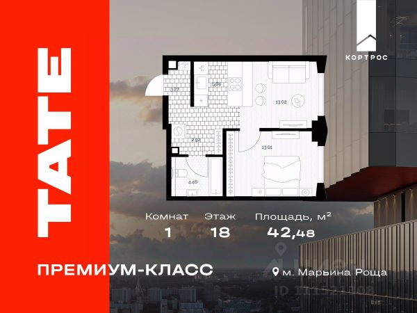 Продаётся 1-комнатная квартира от застройщика в ЖК премиум-класса TATE на 17 этаже. Общая площадь 41,13 м². Отделка предчистовая (white box). Башня В. Срок сдачи: 2 кв. 2027 Выдача ключей: 4 кв. 2027 Проект расположен на границе с ЦАО в районе Марьина Роща на улице Веткина. В шаговой доступности находится метро Марьина роща (5 минут), парки Останкино и Сокольники (15 минут). До центра столицы время в пути составит 15 минут на авто. На территории премиум квартала откроют спа- и фитнес-центр, бассейн, оборудуют детские и спортивные площадки. Предусмотрен подземный двухуровневый паркинг с контролем доступа и лифтом на жилые этажи. Паркинг рассчитан на 568 машино-мест. Доступ в жилой комплекс осуществляется по биометрическому контролю - Face ID. Территория закрытая с видеонаблюдением и консьерж-сервисом 24/7. Особенности башни В • Потрясающие виды на 4 стороны: Москва-Сити | Останкино | ВДНХ | Тимирязевский парк • Уголовок остекление • Большие метражи квартир • Кладовые на этаже • Квартиры с мастер-спальнями и гардеробными Особенности ЖК: - Исторический район; - Панорамная лаундж-зона на высоте 140 м; - На 4041 этажах видовые пентхаусы площадью до 200 м²; - Два вида отделки: лаконичный и монохромный WhiteBox или готовые интерьеры с безупречным чувством меры - Лобби с потолками высотой почти 6 м; - В отдельном 6-этажном здании на территории будут: просторный фитнес-центр с бассейном, концептуальный ресторан, офисные пространства; - Детские зоны и спортивные площадки; - 6 скоростных лифтов; - Лапомойки для животных; - Безбарьерная среда. Продается 1-комнатная квартира в новостройке с отделкой в округе СВАО в Москве.