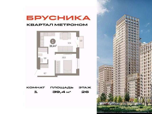 Квартира с кухней-гостиной и одной спальней в квартале "Метроном". Особенности планировки: вид во двор, лоджия, предчистовая отделка. квартиры в нашей базе: КВМ-КВМ01-6-6.8.10.