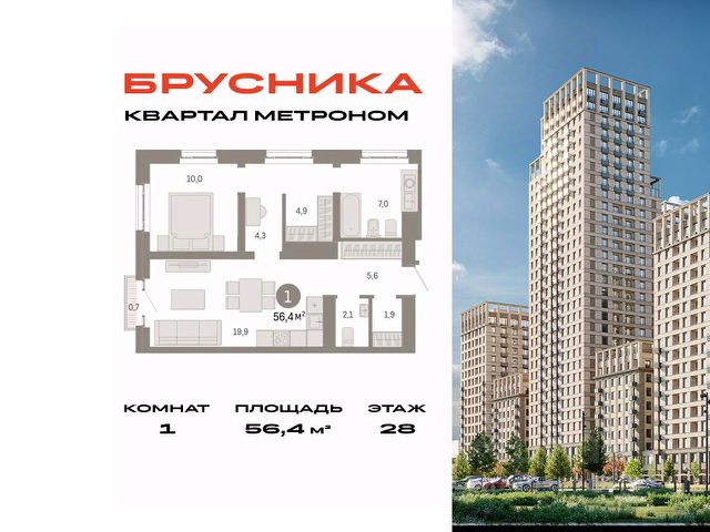 Квартира с кухней-гостиной и одной спальней в квартале "Метроном". Особенности планировки: ипотека 8%, гардеробная, предчистовая отделка, балкон. квартиры в нашей базе: КВМ-КВМ01-6-6.3.6.