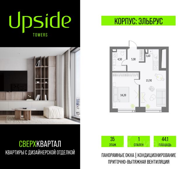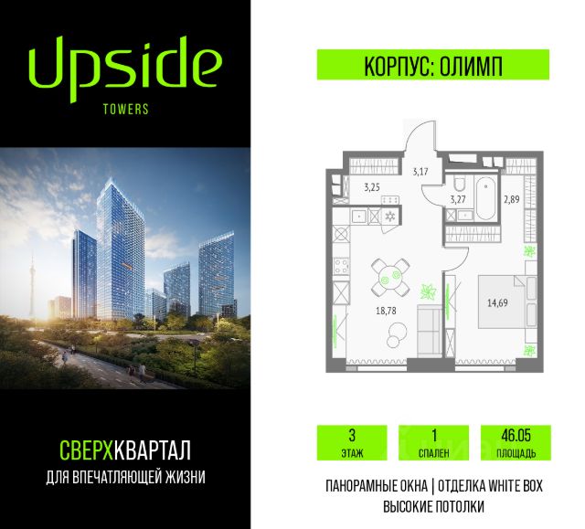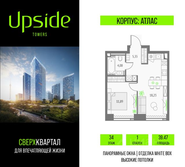 Продаётся 1-комнатная квартира площадью 41.11 кв.м на 18 этаже 47 этажного корпуса Атлас в квартале небоскребов "Upside Towers". В квартире отделка White-box, c видом на корпус Эльбрус, прогулочный бульвар, школу. Номер квартиры Б1805. Upside Towers - технологичный квартал строится в динамично развивающемся Бутырском районе, в 3 мин. от метро, в 5 мин. от ТТК. На территории 7 га возводится 5 высотных башен от 19 до 58 этажей, названных в честь главных вершин земли. Квартиры с панорамными окнами в пол, высокими потолками и современными инженерными решениями. Благоустроенная зеленая территория включает: приватные дворы, природный комплекс, прогулочный бульвар, ландшафтный парк 2,5 га с сенсорным садом и многофункциональными игровыми и спортивными площадками. В корпусе откроются магазины, кафе и рестораны, а также другие объекты коммерческой инфраструктуры. На последнем этаже корпуса предусмотрен SPA Relax центр с панорамным видом на город. Собственники квартир смогут в любое удобное для них время забронировать посещение спа-зоны через смарт-приложение. Дня них будут доступны джакузи, пространства для занятий йогой, а также места для отдыха и релаксации. Большое внимание в проекте уделяется созданию социальной инфраструктуры. Между "Атласом" и "Олимпом" в трехэтажном стилобате разместится уникальное пространство закрытый клуб для жителей квартала Upside Club площадью 2 000 кв. м. Здесь появится каминный зал с роялем, многофункциональная детская зона c двухуровневым игровым оборудованием для малышей и дошкольников, плей-рум для подростков, домашний кинотеатр, коворкинг, переговорные и лектории. На крыше стилобата разместится всесезонная BBQ патио-зона с верандой и закрытыми помещениями для приготовления и отдыха. В башнях откроются смотровые террасы для резидентов с панорамными видами на город, парки, Останкинскую башню, ВДНХ, Ботанический сад и Москва-Сити. Покупая квартиру даже самого минимального размера в Upside Towers, вы получаете в пользование 2 000 м² бесплатных общественных пространств. В рамках проекта строится государственная школа и детский сад, разместится более 15 000 кв.м. коммерческой инфраструктуры. Насыщенная социальная инфраструктура формирует множество сценариев для жизни на территории квартала. В Upside Towers применяются лучшие технологии и практики, чтобы обеспечить высшее качество жизни: Воздух, не уступающий по качеству горному, обеспечит приточно-вытяжная вентиляция. Пятиступенчатая очистка воды с сохранением полезных минералов. Центральное кондиционирование. Внутрипольные конвекторы с естественной конвекцией. Современные системы безопасности и мониторинга микроклимата. Высокоскоростной интернет на всей территории, в квартирах и паркинге за счет усиления GSM-связи всех ведущих операторов. Все места в подземном паркинге оборудованы зарядками для электрокаров. Бутырский район непрерывно развивается и готовится стать новым современным деловым районом Москвы. В рамках программы "Индустриальные кварталы" комплексно