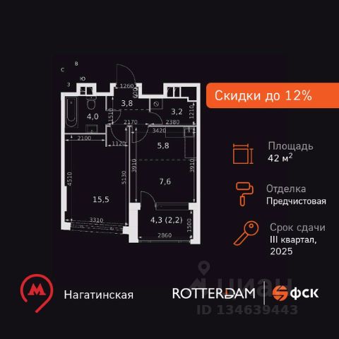 Прямая продажа от застройщика! Жилой Комплекс премиум-класса. Продаётся 1-к квартира номер 223 общей площадью 35.4 кв.м. на 2-м этаже 27 этажного здания. Без отделки. Цена с учётом скидки. Особенности квартиры: - Линейная планировка - максимальная функциональность и удобство. - Увеличенная высота окна - больше воздуха и света. - Постирочная - организуйте пространство для стирки и сушки вещей. - Можно оборудовать рабочее место - комфорт для работы и учёбы. - Ниша под шкаф - компактное и удобное место для вещей. - Тёплая лоджия - пространство для отдыха в любое время года. Информация о комплексе: Премиум-класс прямо на берегу Москвы-реки, с прямым выходом на набережную и потрясающими панорамными видами! На Шелепихинской набережной, расположен причал для речных трамваев. Вам станет доступна единственная столичная транспортная артерия, на которой никогда нет пробок: 20 минут до Москва-Сити, да еще и с вдохновляющими видами по пути. Входные группы домов - это индивидуальные дизайн-проекты, посвященные трем главным местам в жизни Лермонтова: Тарханам, Петербургу и Кавказу, которые объединяют сочетание эстетики и комфорта. Бурная жизнь соседей больше не сможет нарушить ваш покой, а к вам никто не постучит, если вы захотите прибавить громкость в любимом музыкальном треке или Ваши дети захотят устроить ночную пробежку! Живите только по своим правилам. В каждой квартире подключен базовый пакет Умная квартира забудьте о беспокойстве о протечке; настройте свои сценарии управления техникой и электричеством; общайтесь с Умной квартирой голосом; Можете легко расширить базовый пакет и подключить дополнительные опции и устройства, чтобы из любой точки мира управляй работой бытовых приборов и систем, например: включайте разогрев ужина; регулируйте яркость яркость света; регулируйте громкость музыки; настраивайте работу теплых полов; Транспортная доступность: В 50 м до новой станции метро "Звенигородская". Вторая улица от ЦАО и соседство с Москва-Сити. Все виды общественного транспорта, в том числе речные трамвайчики, в пешей доступности Внутренняя инфраструктура: Основная артерия жизни квартала - центральный бульвар. Вы с радостью обнаружите, что путь до престижных школ и вузов, развлечений и магазинов сжался до нескольких минут езды на машине. К вашим услугам: - муниципальные школы и ДОУ, музыкальные и спортивные школы, - 8 муниципальных ДОУ и 2 ДОУ с изучением английского языка - 5 медицинских учреждений - ТРЦ "Хорошо!" и "Авиапарк" - Сетевые фитнес-клубы World Class, X-Fit и др. - Горнолыжные склоны "Лата Трэк", ледовый дворец и гребной канал "Крылатское" и еще 7 природных парков