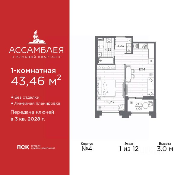 Просторная 1-комн. квартира в Клубный квартал "Ассамблея" на 11 этаже. Квартира без отделки, полностью готова к чистовой отделке и дальнейшему ремонту. Общая площадь: 35.95 кв.м., жилая: 10.37 кв.м., площадь просторной кухни-столовой: 15.68 кв.м. Все окна выходят на одну сторону. В квартире одна лоджия, один совмещенный санузел. Высота потолков 3.0 м. Дом монолитный, трехподъездный, высотой 12 этажей. Квартира находится во 2-й секции в корпусе 4. На этаже 7 квартир. В подъезде 1 пассажирский и 1 грузовой лифт. Начало строительства - 3 квартал 2025 года. Окончание строительства - 3 квартал 2028 года. Оформление сделки по договору долевого участия. В шаговой доступности от жилого комплекса имеются станции метро (расстояние по прямой): "Горный институт" (1.0 км), "Василеостровская" (1.4 км), "Приморская" (1.5 км), также недалеко от этого корпуса расположены станции метро: "Спортивная", "Чкаловская". "Клубный квартал Ассамблея" — проект бизнес-класса на Васильевском острове, в самом сердце исторического Петербурга. Комплекс состоит из пяти корпусов переменной этажности — от 7 до 12 этажей — с выразительной архитектурой в стиле неомодернизма: светлый клинкер, панорамное остекление, просторное лобби с потолками высотой почти 8 метров. Потолки — до 3,2 метров. Подземный паркинг на 667 машиномест. Комфорт и инфраструктура Проект ориентирован на комфортную городскую жизнь. В закрытом дворе — ландшафтное озеленение, современные детские и спортивные площадки. Внутренний клуб для резидентов включает коворкинг, переговорные, кинозал, фитнес и бьюти-зону. IP-домофония с просмотром камер видеонаблюдения, дистанционное открывание дверей и доступа на территорию и в парадную со смартфона и планшета, просмотр показаний счетчиков, приложение для жителей PSK Home. Локация Расположение на Васильевском острове — сильная сторона проекта. До четырех станций метро ("Горный институт", "Василеостровская", "Спортивная", "Приморская") — 515 минут пешком. В шаговой доступности — зелёные зоны, культурные учреждения, в том числе сад "Василеостровец" и ДК имени Кирова. Основные магистрали Большой, Средний и Малый проспекты, Наличная и Уральская улицы. Съезд на ЗСД расположен недалеко от станции метро "Приморская", близ береговой линии. Благовещенский и Дворцовый мосты соединяют остров с центром города, а мосты Тучков, Биржевой и Бетанкура — с Петроградской стороной. Застройщик Группа компаний ПСК является одной из ведущих девелоперских компаний Санкт Петербурга. На протяжении 18 лет она возводит в Северной столице качественное жилье премиум, бизнес и комфорт-класса, социальные объекты школы и детские сады, апарт-отели и торговые центры. Является шестикратным обладателем золотого знака "Надежный застройщик России". #Z6bsIf