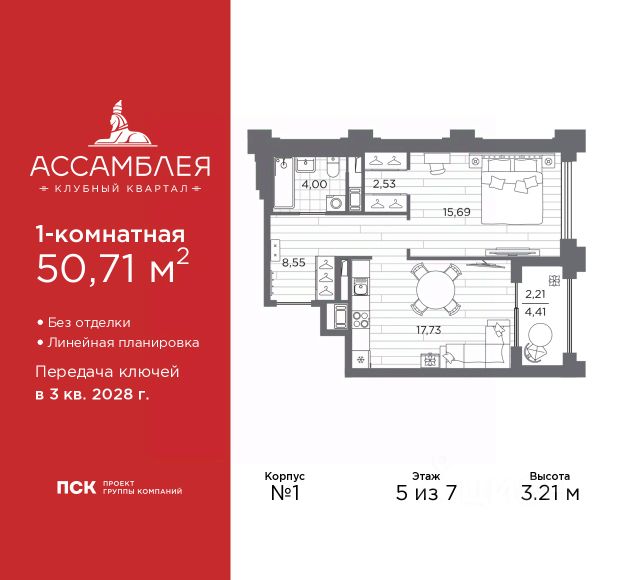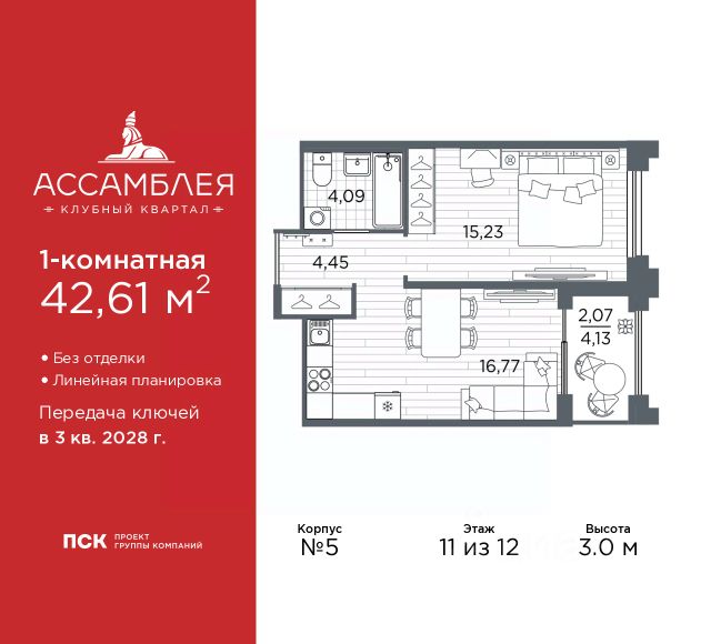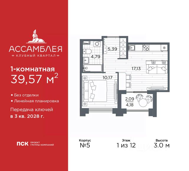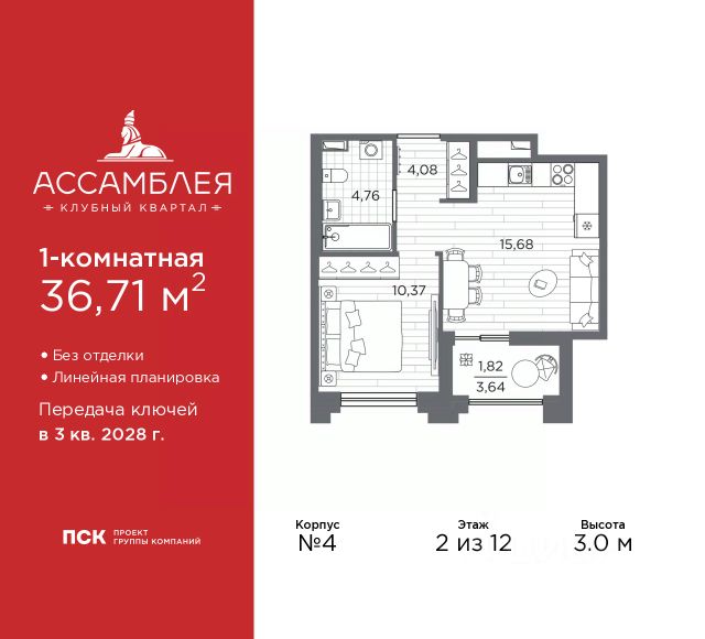 Просторная 1-комн. квартира в Клубный квартал "Ассамблея" на 11 этаже. Квартира без отделки, новый владелец может сделать ремонт по своему проекту. Общая площадь: 35.95 кв.м., жилая: 10.37 кв.м., площадь просторной кухни-столовой: 15.68 кв.м. Все окна выходят на одну сторону. В квартире одна лоджия, один совмещенный санузел. Высота потолков 3.0 м. Дом монолитный, трехподъездный, высотой 12 этажей. Квартира находится во 2-й секции в корпусе 4. На этаже 7 квартир. В подъезде 1 пассажирский и 1 грузовой лифт. Начало строительства - 3 квартал 2025 года. Окончание строительства - 3 квартал 2028 года. Оформление сделки по договору долевого участия. В шаговой доступности от жилого комплекса имеются станции метро (расстояние по прямой): "Горный институт" (1.0 км), "Василеостровская" (1.4 км), "Приморская" (1.5 км), также недалеко от этого корпуса расположены станции метро: "Спортивная", "Чкаловская". "Клубный квартал Ассамблея" — проект бизнес-класса на Васильевском острове, в самом сердце исторического Петербурга. Комплекс состоит из пяти корпусов переменной этажности — от 7 до 12 этажей — с выразительной архитектурой в стиле неомодернизма: светлый клинкер, панорамное остекление, просторное лобби с потолками высотой почти 8 метров. Потолки — до 3,2 метров. Подземный паркинг на 667 машиномест. Комфорт и инфраструктура Проект ориентирован на комфортную городскую жизнь. В закрытом дворе — ландшафтное озеленение, современные детские и спортивные площадки. Внутренний клуб для резидентов включает коворкинг, переговорные, кинозал, фитнес и бьюти-зону. IP-домофония с просмотром камер видеонаблюдения, дистанционное открывание дверей и доступа на территорию и в парадную со смартфона и планшета, просмотр показаний счетчиков, приложение для жителей PSK Home. Локация Расположение на Васильевском острове — сильная сторона проекта. До четырех станций метро ("Горный институт", "Василеостровская", "Спортивная", "Приморская") — 515 минут пешком. В шаговой доступности — зелёные зоны, культурные учреждения, в том числе сад "Василеостровец" и ДК имени Кирова. Основные магистрали Большой, Средний и Малый проспекты, Наличная и Уральская улицы. Съезд на ЗСД расположен недалеко от станции метро "Приморская", близ береговой линии. Благовещенский и Дворцовый мосты соединяют остров с центром города, а мосты Тучков, Биржевой и Бетанкура — с Петроградской стороной. Застройщик Группа компаний ПСК является одной из ведущих девелоперских компаний Санкт Петербурга. На протяжении 18 лет она возводит в Северной столице качественное жилье премиум, бизнес и комфорт-класса, социальные объекты школы и детские сады, апарт-отели и торговые центры. Является шестикратным обладателем золотого знака "Надежный застройщик России". #26bsIF