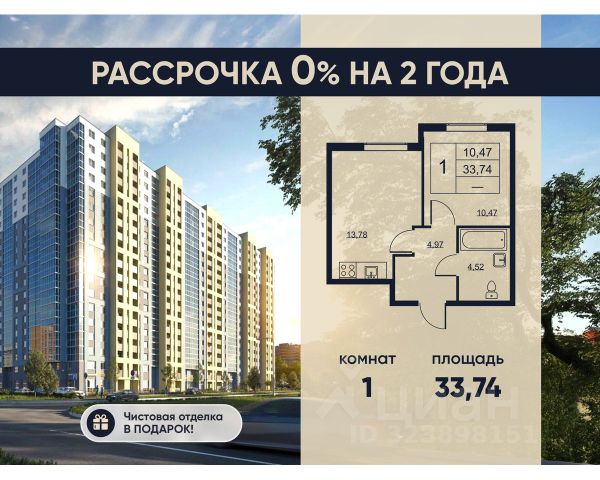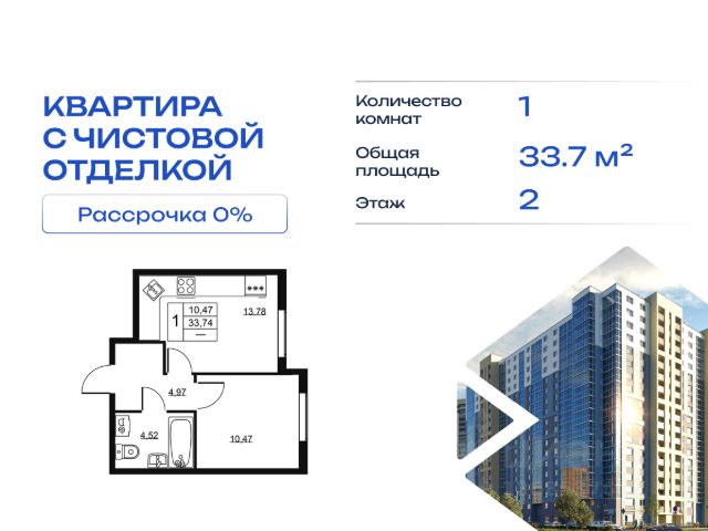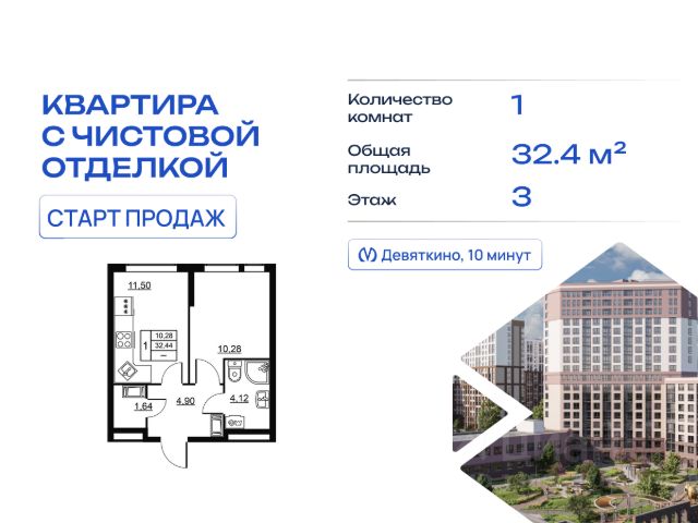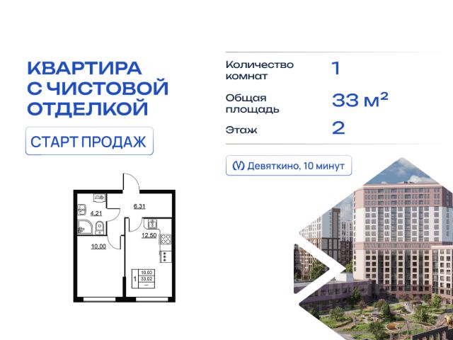 Продается однокомнатная квартира в жилом комплексе "Высота. Новодевяткино" от ГК СТОУН нa 2 этаже. Общaя площадь cоcтaвляeт 33.02 кв. м. Квартира без отделки. Жилой кoмплeкc располагается по адресу: Ленинградская обл., Всеволожский район, д. Новое Девяткино, ул. Главная. "Высота. Новодевяткино" - современный комплекс комфорт-класса. Проект расположен в Новом Девяткино, рядом с живописной зеленой зоной, рекой Охтой и Капральевым ручьем. Транспортная доступность: 10 минут до выезда на КАД; 10 минут до ст.м. Девяткино. О проекте "Высота. Новодевяткино" включает в себя 4 корпуса переменной этажности от 8 до 18 этажей. Архитектура и внешний вид домов вдохновлен гармонией природы: благородная палитра фасадной штукатурки в сочетании с искусственным камнем. "Изюминка" проекта декоративная стена, которая обрамляет внешнюю сторону домов. В проекте представлены квартиры различных планировок от студий до семейных трехкомнатных квартир площадью от 24.74 м² до 79.44 м². Высота потолков в чистовой отделке составляет 2.8 м. На выбор представлены уютные студии с двумя окнами, квартиры с гардеробными, мастер-спальнями, двумя санузлами. Все лоты будут передаваться с чистовой отделкой. Для удобства хранения сезонных вещей и спортивного инвентаря на минус первом этаже предусмотрены кладовые. Также на цокольном этаже также будут расположены подземных 2 паркинга вместимостью 188 машиномест каждый. Благоустройство Проект жилого комплекса включает различные функциональные зоны как для активного, так и спокойного отдыха. Для юных жителей предусмотрены игровые площадки. Для создания уютной атмосферы в жилом комплексе предусмотрены малые архитектурные формы и приватные места для встреч с соседями. Во дворе будут высажены деревья и пышные кустарники. Инфраструктура На данный момент в районе уже действуют детские сады, организации дополнительного образования, медицинское учреждение. Кроме того, в самом ЖК запланировано дошкольное учреждение на 88 мест, что существенно сэкономит время родителей. На первых этажах разместится зона ритейла: чтобы купить свежие булочки и кофе на завтрак или ингредиенты для ужина можно просто спуститься на первый этаж. Рядом расположены парки и зеленые зоны, где можно прогуляться, активно отдохнуть и насладиться свежим воздухом. Ключевые преимущества: подземный паркинг; дворы закрыты декоративной стеной со стороны лицевых фасадов; благоустроенная придомовая территория с детскими и спортивными площадками, зонами отдыха;; детский сад на территории жилого комплекса; разнообразные планировочные решения; безбарьерная среда; видовые квартиры; стильные входные группы.
