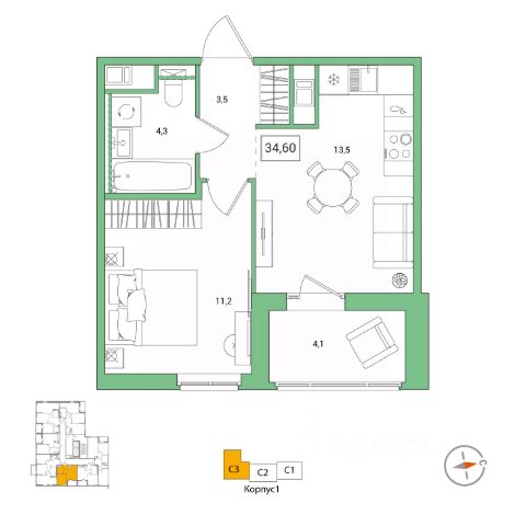 Продаётся 1 комнатная квартира 13 в ЖК Янила Драйв, 4 очередь, корпус 3