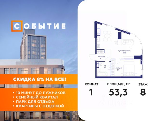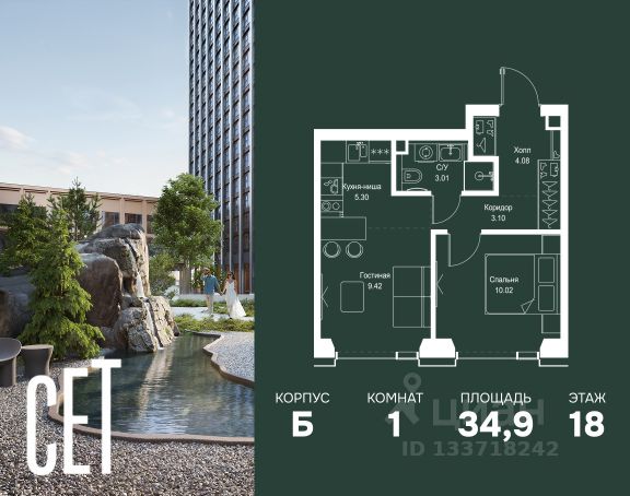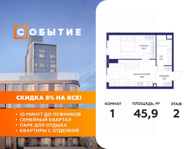 Старт продаж новой очереди! Продаётся 1-комнатная квартира общей площадью 32.97 м² без отделки в ЖК Веер на 2-м этаже 70 этажного дома. Веер.2 — вторая очередь футуристичного квартала бизнес-класса Веер. Это новая экосистема в престижном Западном округе Москвы, поражающая масштабностью внутренней инфраструктуры. ЖК находится всего в 5 минутах от Кутузовского проспекта и в 15 минутах от Сколково. Ансамбль из четырех стеклянных башен с доминантой в 237 метров разработан по принципу современного урбанизма и выражен в лаконичных объемах — параллелепипедах со сглаженными углами, которые придают зданиям утонченный вид. Расположение и транспортная доступность: • Образовательный комплекс в составе топовой школы, состоящий из двух зданий: основное на 1500 школьных и 450 дошкольных мест, отдельное здание детского сада на 300 мест. • Парк "Долина реки Сетунь" площадью более 700 гектаров • Рядом МГУ, МГИМО, РАНХиГС и Академия ФСБ • 15 минут по Кутузовскому проспекту до ужина в центре с видом на Москву-реку • 18 минут пешком до м. "Давыдково" • Открытие новых станций метро в шаговой доступности в будущем Инфраструктура: Двор в Веер.2 — это ассиметричные холмы, каменные "лабиринты", зеленые ковры и хвойные островки с единой живой экосистемой. Здесь есть все: • Павильон умиротворения Место отдыха под навесом в спокойной части двора, окруженное деревьями. • Активная тропа Тактильная дорога из камней разного диаметра для расслабляющих прогулок. • Бизнес-гарден Оборудованное пространство для работы на свежем воздухе со столом и встроенными розетками. • Детская площадка Двухуровневая площадка "Ботаника" с песочницей, переговорной трубой и горкой "Дружба". Компания MR предлагает своим клиентам специальные условия приобретения квартир в рамках программ ипотечного кредитования от банков-партнеров.
