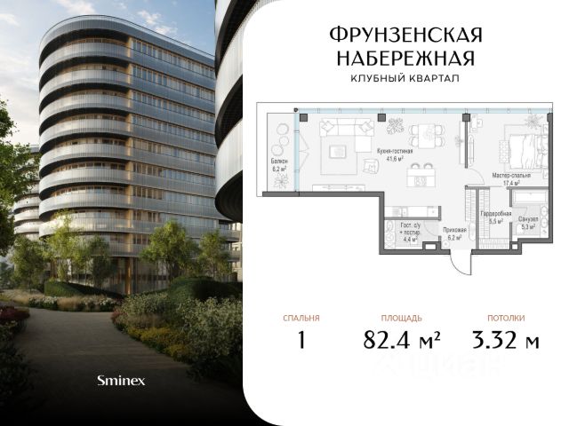 Просторная квартира с одной спальной комнатой. Приватная зона оснащена вместительной гардеробной и просторной ванной комнатой, а площадь кухни-гостиной позволит с комфортом принять гостей.