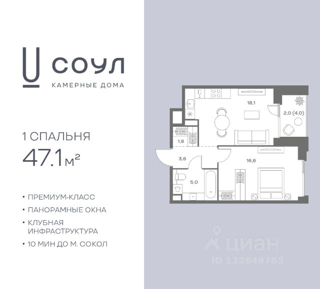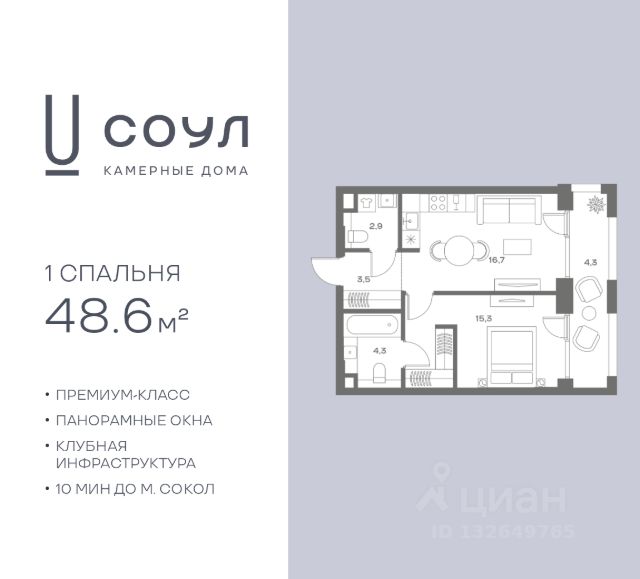 Продаются 1-комнатные апартаменты 48.43 кв.м. на 4-м этаже 20-этажного комплекса.
