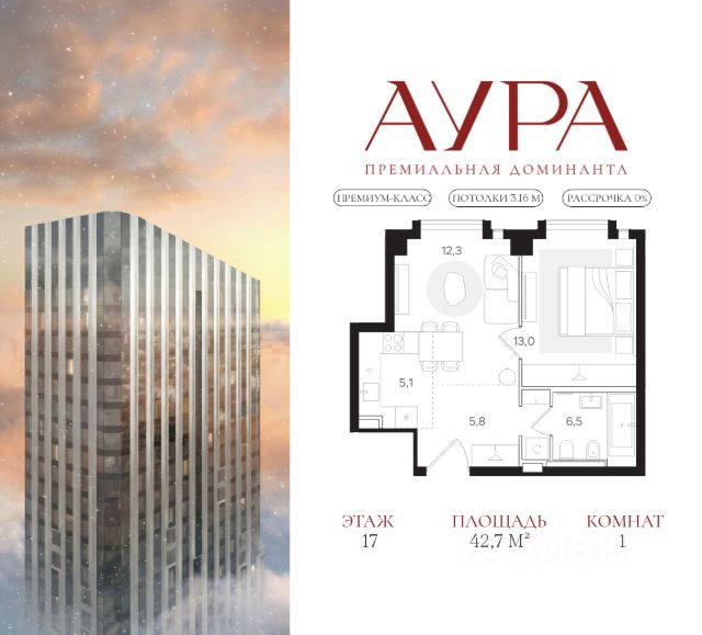 1-комнатная квартира площадью 40 м2. Высота потолков 3,16 м. Этаж 39 из 42. Вид из окон - на воду. О проекте АУРА новая премиальная доминанта Москвы в 10 минутах от Садового кольца. Проект состоит из 42-этажной Бронзовой башни и 41-этажной Серебряной. Рядом набережная Москвы-реки, Даниловский рынок, музеи и галереи, престижные школы и вузы. Двор и благоустройство Приватная территория АУРЫ состоит из нескольких функциональных зон для тихого отдыха, работы и активного времяпровождения на свежем воздухе. На нижнем уровне расположены детские и спортивные площадки, скалодром и крытый павильон для подвижных игр. Выше — амфитеатр для отдыха и вечерних променадов, уличный коворкинг с мебелью и лаунж-зоны с лежаками у воды. На крыше — тихий уголок для занятий йогой, встречи рассветов и наслаждения закатами. По всему двору проложены пешеходные дорожки с подогревом в зимний сезон. Придомовую территорию АУРЫ украсит уникальный для Москвы объект — скала из натурального камня с водопадом, которая станет новой городской достопримечательностью. Эксклюзивная инфраструктура Только для резидентов: • Бьюти-комната • Коворкинг, переговорные и акустические кабинеты • Детская игровая комната • Спортзал и студия для тренировок • Просторные колясочные • Сервисная комната • Лапомойки для домашних питомцев Инфраструктура в составе проекта: • Ресторан авторской кухни • Современная медицинская клиника • Частный детский сад • Бизнес-центр класса "А" • Коммерческие помещения, закрывающие любые потребности — супермаркет, химчистка и др. Атрибуты комфорта • Индивидуальная вентиляция квартир • Вентиляция с очисткой воздуха в общих зонах • Мультизональное центральное кондиционирование (VRF) • Горячая вода круглый год • Вода качества, сопоставимого с питьевой • Усиленная звукоизоляция квартир Входные группы • Гранд-лобби в стиле современной роскоши • Дизайнерские лобби в каждой башне • Панорамное остекление Квартиры Более 40 планировок: от уютных студий до просторных семейных лотов. Всего 916 квартир площадью от 28,1 до 148,8 м². Высота потолков от 3,16 до 6,2 м. Уникальные планировки: • Квартиры с террасами • Квартиры с окном в ванной • Квартиры с круговым остеклением • Двухуровневые пентхаусы Паркинг и келлеры Двухуровневый подземный паркинг на 563 парковочных места: • Постоянные места: 496 (в том числе 48 мест для маломобильных) • Гостевые места: 67 • Персональные кладовые и велостанция • Мойка автомобилей • Станция для подкачки шин • Зарядки для электромобилей • Зона для разгрузки крупногабаритных предметов Интеллектуальные системы • Персональный бесконтактный доступ на территорию и в здание по электронному ключу (Bluetooth/RFID) • Премиальные лифты Mitsubishi • Автоматический въезд на паркинг для резидентов по распознаванию номеров • Круглосуточное видеонаблюдение с возможностью push-уведомлений • Система датчиков для круглосуточного мониторинга • Усиленный сигнал связи — стабильный прием сотовой связи и интернета на всей территории Сервис • Упр