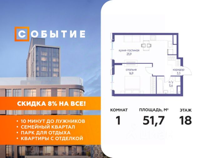 1 день до окончания акции "Скидка 8%" Весь март - скидка до 8% действует до 31.03.2026 г. при 100% оплате и не субсидированной ипотеке! В продаже 1-к квартира от застройщика. Общая площадь 45.90, жилая 16.60, кухня 18. Квартира расположена на 2 этаже жилого квартала "Событие-6", корпус 1, Секция Секция 1. Квартира без отделки. Срок сдачи: 4 кв. 2029 года. СОБЫТИЕ.6 — финальный дом парк-квартала СОБЫТИЕ на Мосфильмовской. Переезжайте в уже сформированный квартал с готовой инфраструктурой и парком! Премиальный жилой комплекс в престижном районе Москвы предлагает стильную архитектуру, продуманное благоустройство и великолепно разнообразие общественных пространств. Свой парк прямо возле дома! Архитектура Архитектура СОБЫТИЯ.6 выполнена в ультрасовременном стиле московским бюро Atrium на основе дизайн-кода британских архитекторов LDA Design и UHA London. Дом отличает оригинальная геометрия фасадов, большое остекление и высокие лобби (до 6,2 м) с авторской мебелью и светильниками. Расположение Мосфильмовская улица (Раменки) — один из престижных районов Москвы. Близость к историческому и деловому центру, природным зонам Запада столицы. Транспортная доступность: • 10 мин до Москва-Сити и ТТК; • 15 мин до Садового кольца; • 25 мин до аэропорта Внуково; • 7-10 мин до станций метро "Аминьевская" и "Мичуринский проспект". Инфраструктура: • парк "Событие" (12 га, финалист конкурса Правительства Москвы) с беговыми (1,5 км) и велодорожками (2,7 км), экотропой (1,6 км), площадками, лекторием; • школа, детский сад, магазины, салоны красоты, рестораны (к моменту заселения); • мультидвор с игровыми и спортивными площадками, мини-бульваром; • общественная терраса на 10-м этаже (коворкинг, лаунж); • Закрытые общественные пространства: детская комната, спортивный зал, коворкинг, лаунж-зоны. Паркинг 256 мест для жителей (48 — для электромобилей), 24 гостевых (5 — для электромобилей), мойки колес, кладовые, зоны для велосипедов. Окружение Парки и заповедники (Воробьёвы горы, Матвеевский лес и др.), МГУ, театр им. Н. И. Сац, стадион "Лужники". Безопасность Видеонаблюдение, контроль доступа, видеодомофоны, консьерж-сервис 24/7, системы пожарной безопасности и мультисервисная оптическая сеть.