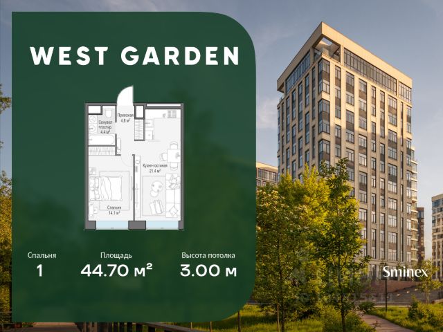 Комфортная и продуманная до мелочей 1-спальная квартира площадью 44.50 кв. м на 10 этаже в клубном доме 16. Увеличенная площадь окон и высота потолков 3.00 м дарят впечатляющие виды на парки, зеленые зоны и природные заказники. West Garden - это собрание клубных домов высотой 12-14 этажей в собственном парке 16 гектаров вдоль реки. Просторный среднеэтажный квартал расположен на Минской улице, в респектабельном Западном округе столицы. Вокруг премиальное окружение и более 1000 гектаров парков. West Garden - это возможность обеспечить себе и своей семье лучшие условия для жизни в одном из самых привлекательных и зелёных районов столицы. Гармония природы дополнена здесь впечатляющими возможностями и привилегиями: • Расположение в зелёном Западном районе столицы вблизи центра и ключевых магистралей в окружении парковых зон (заказник "Долина реки Сетунь", Мосфильмовский пруд, Ботанический сад МГУ, природный заказник "Воробьёвы Горы", Парк Победы на Поклонной горе) • Современная лаконичная архитектура, у каждого дома свой индивидуальный облик и выразительный фасад с использованием натуральных и долговечных материалов (гранит, известняк, клинкерный кирпич) • Функциональные лобби с отделкой из дерева и натурального камня с высокими потолками до 7,8 м • Самый большой собственный парк для прогулок и отдыха: 8 га собственной закрытой и благоустроенной территории, а также 8 га прилегающего парка на набережной с зонами отдыха с шезлонгами, маршрутами для бега, пеших и велосипедных прогулок • Инфраструктурный центр Clubhouse только для жителей: клубная гостиная с террасой и творческой атмосферой по фирменному стандарту Friend`s Lab, детская игровая зона 300 кв. м по стандарту Kid`s Lab • Насыщенная и разнообразная инфраструктура для детей любого возраста: 8 развивающих детских площадок в парке, 3 детские площадки на благоустроенной набережной, площадка для отдыха и досуга подростков • Спортивная инфраструктура по стандарту Fit Lab: многофункциональные площадки для футбола, баскетбола, волейбола с трибуной для болельщиков, зона воркаута, теннисные столы, зона для йоги, беговая дорожка 3 километра, фитнес-центр только для жителей • Комфортный и просторный подземный паркинг на 1313 машино-мест, 482 келлера, автомойка только для жителей на четыре поста