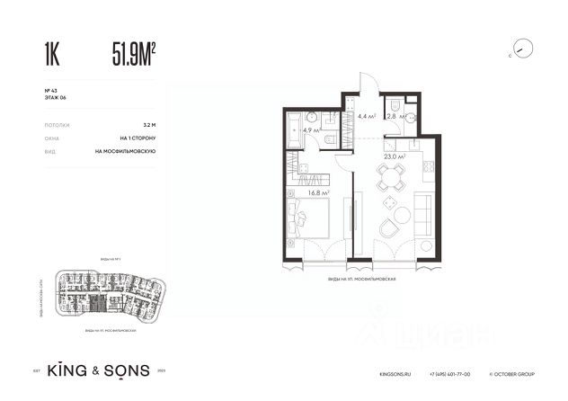 KING & SONS это клубный дом на 117 резиденций премиум-класса, расположенный на престижной и исторической улице Мосфильмовская. Из большинства квартир открываются панорамные виды на МГУ, "Москву-Сити", особняки посольств и парки. Это место для тех, кто не хочет выбирать между комфортом мегаполиса и уединением на природе. Проект разработан японским архитектурным бюро NIKKEN. Фасады из натурального камня, мягкие формы здания, максимально открытое остекление, окна в пол — все это делает облик здания выразительным и уникальным. В проекте предусмотрено 70% квартир с террасами. Потолки от 3,2 до 4,7 м. Паркинг на 110 машиномест. Для будущих резидентов продуманы разнообразные общественные пространства зимний сад в лобби первого этажа, секретный сад с зоной открытого огня, лаундж-зона с кинотеатром на крыше, собственный спортзал, зоны для занятий йогой и медитацией. KING & SONS это фамильная недвижимость, которую с гордостью передают по наследству, как искусство и бриллианты. Продается 1-комнатная квартира от застройщика рядом с метро Раменки.