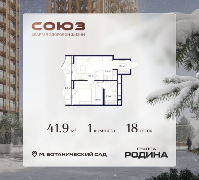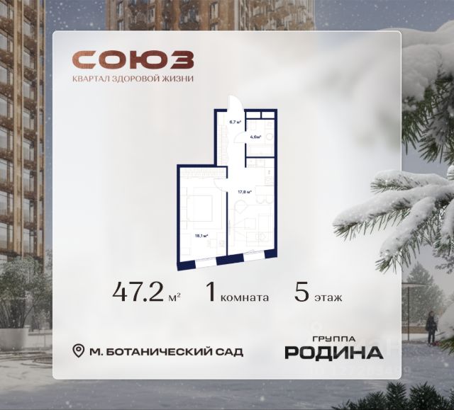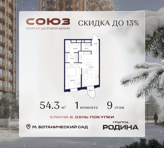 Рассрочка 0% Продаётся 1-комнатная квартира площадью 42.9 м² на 9 этаже в Жилом Комплексе "Союз". Квартал здоровой жизни премиум-класса с рекордным количеством олимпийских видов спорта: - Ледовая арена для хоккея и фигурного катания, - Футбольные поля для тренировок, - Спортивный зал для фехтования, - Бассейн на 6 дорожек, - Центр единоборств, - 4 крытых площадки для настольного тенниса, - 7 теннисных кортов (крытых и открытых), - 4 крытых площадки для сквоша, - Легкоатлетический стадион, - Площадки для баскетбола и волейбола. Уникальные форматы квартир с мастер-спальнями, приватными террасами, балконами, а также пентхаусы с открыточными видами на город. Все квартиры продаются с отделкой Shell&Core и панорамным остеклением. Расположение Пешком: - 2 мин. до парка "Сад Будущего"; - 6 мин. до ст. м. "Ботанический сад"; - 6 мин. до ст. МЦК "Ботанический сад"; - 6 мин. до парка "Леоновская роща"; На автомобиле: - 2 мин. до СВХ (МСД); - 5 мин. до Проспекта Мира; - 10 мин. до ТТК; - 15 мин. до Садового кольца; - 25 мин. до аэропорта "Шереметьево". Благоустройство - собственная спортивная инфраструктура 7 Га; - зона для пикников; - игровые и спортивные площадки для детей всех возрастов; - розарий, а также сосновые, каштановые и дубовые аллеи; - площадки под открытым небом для занятий спортом и йоги; - игровые комнаты для детей; - лаунж-зона для резидентов; - просторная переговорная для деловых встреч; - премиальный ресторан "Шабада" Сосо Павлиашвили с водными арт-объектами на прогулочной аллее, садом ароматных трав и сценой под открытым небом; - кафе, химчистки, аптеки и супермаркеты рядом с домом. Окружение - 8 парков: Сад Будущего, Леоновская роща, Хуамин, Главный ботанический сад РАН, Шереметьевская дубрава, Останкино, парк спорта "Яуза", пойма реки Яуза и музей-усадьба "Останкино"; - 3 ВУЗа: ВГИК, РГСУ, МГПУ; - 12 школ, в том числе: школа 1499 им. И.А. Докукина (топ 100), Brookes Moscow, IThub школа; - 18 детских садов, в том числе билингвальный ALERTUM KIDS; - один из крупнейших океанариумов Европы "Москвариум"; - один из крупнейших в Европе торгово-развлекательных центров "Европолис". Продается 1-комнатная квартира от застройщика рядом с метро Свиблово.
