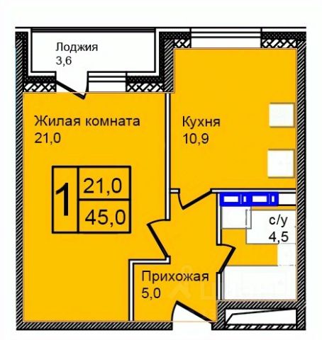 Продаётся 1-комнатная квартира в строящемся доме (Корпус 1), срок сдачи: IV-кв. 2027, общей площадью 45.9 кв.м., на 9 этаже.