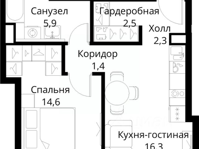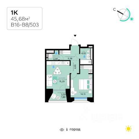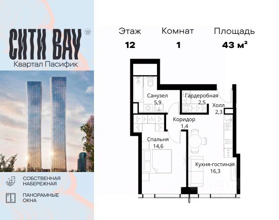 В продаже — однокомнатная квартира, общей площадью 45,68 кв. м. Квартира расположена на пятом этаже десятиэтажного корпуса Балансд в квартале В16 нового района СберСити, который строит Сбер. Архитектуру квартала В16 создало итальянское бюро ARCHEA middle east: каждый дом узнаваем, но вместе они складываются в спокойный, цельный ансамбль. В облицовке сочетаются тёплые оттенки кирпича и металла, за счёт игры фактур фасады выглядят живыми и меняются в разное время дня. Строгая геометрия поддерживает ритм города, а мягкая природная палитра помогает чувствовать себя дома, а не в деловом квартале. Дом возводится по технологии монолитного строительства. Квартиры передаются без отделки, что позволяет будущим владельцам реализовать собственные дизайнерские решения и индивидуальные планировки. В квартирах предустановлена система "умный дом", объединяющая управление квартирой, домом и прилегающей территорией. Можно регулировать климат и освещение голосом или через смартфон. Квартал состоит из девяти домов средней этажности — от 7 до 10 этажей. Корпуса формируют большой внутренний двор площадью два гектара. Во дворе предусмотрены зоны для разных сценариев: просторные площадки для детей, пространства для активного досуга и спорта, тихие места для отдыха и спокойного времени, а также удобные рабочие места под открытым небом. Здесь легко найти своё — для жизни, здоровья и занятий тем, что действительно нравится. В доме предусмотрены: уютное лобби с зоной ожидания, лапомойка, санузел, помещение для хранения колясок и велосипедов, подземный паркинг. СберСити — это новый жилой и деловой район на западе Москвы, в одном из самых экологически чистых и престижных мест столицы. Это первая в России и крупнейшая в мире инновационная городская среда, созданная по международным стандартам зелёного проектирования. Здесь внедряются решения в области энергоснабжения, вакуумного мусороудаления, тестирования зелёных технологий, а в дальнейшем — системы искусственного интеллекта для управления домами и городской инфраструктурой. Строительство проекта началось в 2021 году, заселение первых корпусов — с лета 2024-го. Общая площадь территории — 461 га, из них более 2,5 млн кв. м жилья и около 833 тыс. кв. м офисных пространств. Будет построено 7 школ, 13 детских садов и 2 поликлиники. В СберСити будут жить 65 тыс. человек и работать 70 тыс. Развитием территории занимается АО "Рублёво-Архангельское", входящее в группу Сбер. СберСити — место, где хочется жить, работать и растить детей. Переезжайте в СберСити!