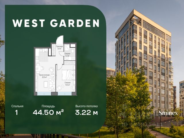 Комфортная и продуманная до мелочей 1-спальная квартира площадью 44.50 кв. м на 10 этаже в клубном доме 16. Увеличенная площадь окон и высота потолков 3.21 м дарят впечатляющие виды на парки, зеленые зоны и природные заказники. West Garden - это собрание клубных домов высотой 12-14 этажей в собственном парке 16 гектаров вдоль реки. Просторный среднеэтажный квартал расположен на Минской улице, в респектабельном Западном округе столицы. Вокруг премиальное окружение и более 1000 гектаров парков. West Garden - это возможность обеспечить себе и своей семье лучшие условия для жизни в одном из самых привлекательных и зелёных районов столицы. Гармония природы дополнена здесь впечатляющими возможностями и привилегиями: • Расположение в зелёном Западном районе столицы вблизи центра и ключевых магистралей в окружении парковых зон (заказник "Долина реки Сетунь", Мосфильмовский пруд, Ботанический сад МГУ, природный заказник "Воробьёвы Горы", Парк Победы на Поклонной горе) • Современная лаконичная архитектура, у каждого дома свой индивидуальный облик и выразительный фасад с использованием натуральных и долговечных материалов (гранит, известняк, клинкерный кирпич) • Функциональные лобби с отделкой из дерева и натурального камня с высокими потолками до 7,8 м • Самый большой собственный парк для прогулок и отдыха: 8 га собственной закрытой и благоустроенной территории, а также 8 га прилегающего парка на набережной с зонами отдыха с шезлонгами, маршрутами для бега, пеших и велосипедных прогулок • Инфраструктурный центр Clubhouse только для жителей: клубная гостиная с террасой и творческой атмосферой по фирменному стандарту Friend`s Lab, детская игровая зона 300 кв. м по стандарту Kid`s Lab • Насыщенная и разнообразная инфраструктура для детей любого возраста: 8 развивающих детских площадок в парке, 3 детские площадки на благоустроенной набережной, площадка для отдыха и досуга подростков • Спортивная инфраструктура по стандарту Fit Lab: многофункциональные площадки для футбола, баскетбола, волейбола с трибуной для болельщиков, зона воркаута, теннисные столы, зона для йоги, беговая дорожка 3 километра, фитнес-центр только для жителей • Комфортный и просторный подземный паркинг на 1313 машино-мест, 482 келлера, автомойка только для жителей на четыре поста 1-комнатная квартира от застройщика в районе Раменки в Москве.