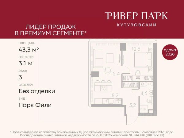 Продается 1-к квартира площадью 43.3 кв.м. на 3-м этаже в жилом комплексе премиум-класса Ривер Парк Кутузовский в Башне Янтарь Премиальный жилой комплекс Ривер Парк Кутузовский строится в одном из самых престижных районов столицы Дорогомилово, на берегу Москвы-реки с лучшими видами на Москва-Сити. Яркий проект в стиле эко-футуризма станет самым масштабным и самым высотным ЖК в локации Кутузовского проспекта. Расположение и Транспортная доступность: • На берегу Москвы-реки, напротив Москва-Сити • 600 метров до Кутузовского проспекта • Удобный съезд с ТТК • Прямой выезд на МКАД по Проспекту Багратиона. • В пешей доступности 3 станции метро: Фили, Парк Победы, Кутузовская, а также станция МЦД Фили. Архитектура от именитого бюро ADM отличается уникальной пластикой фасадов - башни словно парят в воздухе, играя гранями как драгоценные камни. Жилой комплекс состоит из 5-ти небоскребов с приватным парком 2 Га и внешней торговой галереей с открытым доступом. В закрытом внутреннем дворе уникальная по насыщенности клубная инфраструктура только для жителей: • Площадка Мультиспорт (баскетбол, футбол, воллейбол, большой теннис) • Детский игровой клуб Немо • Музыкальная студия • Клуб Гедонист с бильярдной • Студия стиля для стилистов и массажа • Гольф-симулятор • Караоке Впервые в Москве лаунж-зоны на крыше небоскребов, только для жителей: • Всесезонные беседки иглу • Джакузи • Гриль • Площадка для занятий йогой • Самые высоки качели на крыше в России • Видовые площадки Благоустройство комплекса занимает 3 гектара и разработано мировым экспертом по городским парковым ландшафтам - голландским бюро WEST8. Концепция проекта дать жителям отдохнуть от городского ритма и расслабиться среди природы. В Приватном парке уже высажены хвойные деревья-крупномеры сосны и ели. • Зеркальный пруд с арт-объектом • Две детские площадки • Точка спорта с тренажерами и турниками • Цветущий сад • Зеленый театр со сценой и проектором • Видовая зона отдыха с очагом • Солнечная терраса с лежаками На территории жилого комплекса планируется строительство коммерческого образовательного центра, включающего детский сад на 200 мест и школу на 460 мест.