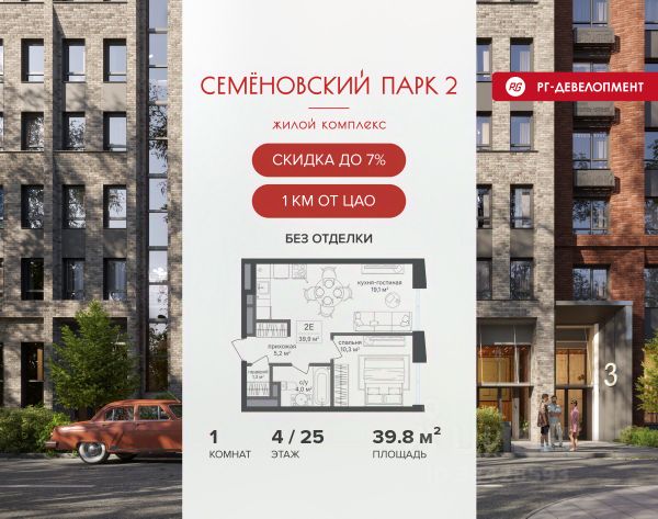 Ипотека для каждого! Полная стоимость кредита от 12,380% до 18,537%. Ставка от 0,11% в АО "Альфа-Банк", ген. лицензия ЦБ РФ 1326 от 16.01.2015. Ставка фиксируется на первые 12 месяцев, далее полная стоимость кредита от 22,022% до 24,599% ставка 21,59%. Первоначальный взнос — от 20,1% от стоимости квартиры. Срок кредитования — от 4 до 30 лет. Ипотека на весь срок! Полная стоимость кредита от 23,396% до 26,058% со ставкой 14,5%! Первоначальный взнос —от 20,01% от стоимости квартиры. Срок кредитования — от 3 до 30 лет. АО "Банк ДОМ.РФ" универсальная лицензия Банка России 2312 от 19.12.2018. Скидка 7% при покупке квартиры! Цена указана с учетом максимального размера скидки. Продается 1-к квартира 39,8 кв.м. в ЖК "Семеновский парк 2" на 4-м этаже 25 этажного дома. Компания "РГ-Девелопмент" предоставляет скидку на квартиры в жилом комплексе. Акция действительна до 31.03.2026 включительно. Чтобы воспользоваться предложением, необходимо подписать договор на приобретение недвижимости до 31.03.2026 включительно. Компания "РГ-Девелопмент" вошла в ТОП-10 девелоперов по объёму введённого жилья в "Старой Москве" по итогам 2025 года. Прямая продажа от застройщика! Квартиры без отделки. Срок сдачи корпуса - 1 кв. 2026 г., корпус сдан. Выдача ключей. ЖК "Семеновский парк 2" - это идеальное место для того, чтобы стать вашим домом. Проект расположен в исторической части Москвы вблизи Измайловского лесопарка, в 1 км от ЦАО. 4 станции метро отделяют вас от Красной площади и 15 минут на автомобиле - от Садового кольца.