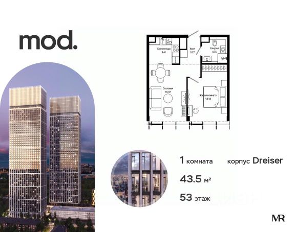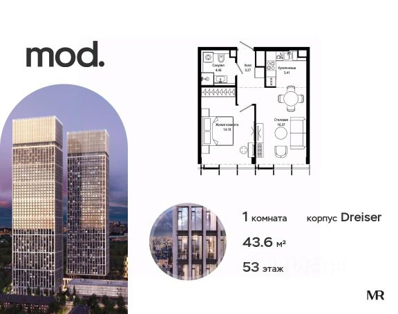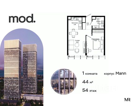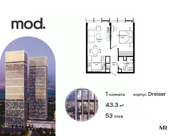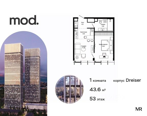 Прямая продажа от застройщика. Продается 1-комнатная квартира общей площадью 43.39 м² без отделки в ЖК премиум-класса Mod на 51-м этаже 55 этажного дома. Mod - жилой комплекс премиум-класса в историческом районе Москвы Марьина Роща, состоящий из трех клубных домов (9 этажей) и трёх разноэтажных башен (44-55 этажей). Закрытая территория жилого комплекса, продуманное благоустройство, эксплуатируемые кровли стилобата, образовательный центр с детским садом создают приватное пространство для тихой семейной жизни, а городская площадь с фонтанами, ресторан, супермаркет, коммерческая инфраструктура на первых этажах привносят созвучную с ритмом города динамику. Преимущества проекта: - В шаговой доступности новый деловой кластер Москвы - Выразительная авторская архитектура - Единственные в Москве фасады башен из натурального камня - Панорамное остекление и высота потолков до 4,8 м - Квартиры и апартаменты с отделкой MR Base - Многоуровневое благоустройство с зонированием на закрытой территории - Многофункциональный образовательный детский центр с детским садом - Двухуровневый подземный паркинг Транспортная доступность: - 5 минут пешком до станции метро "Марьина Роща" - 3 минуты до ТТК - 15 минут до Цветного бульвара Компания MR предлагает своим клиентам специальные условия приобретения квартир в рамках программ ипотечного кредитования от банков-партнеров.