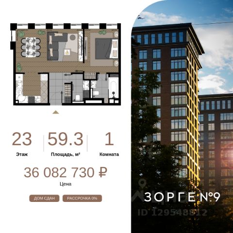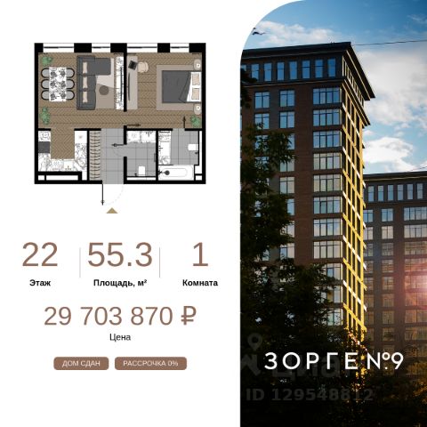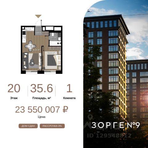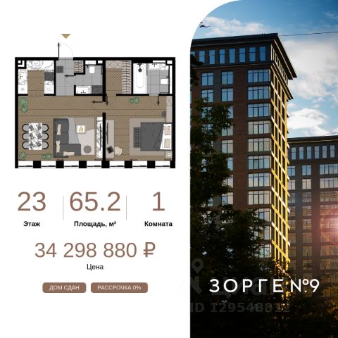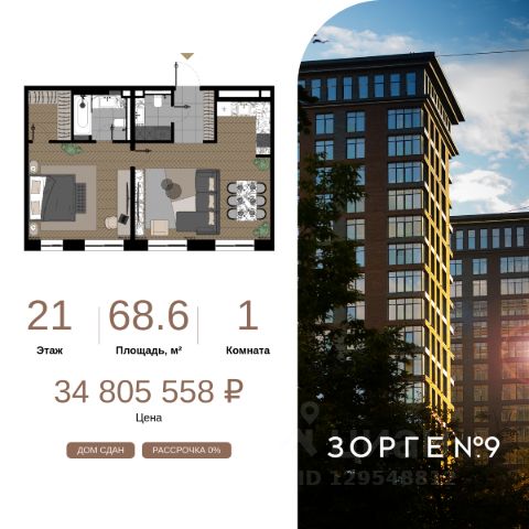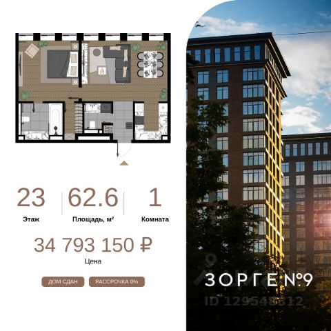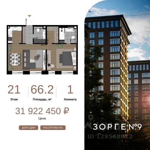 "Зорге 9" — готовые апартаменты бизнес-класса на Ходынке. 10 минут до Москва-Сити. Архитектура: 3 современных корпуса с фасадами в стиле архитектуры Нью-Йорка и с сервисами премиальных отелей, высотой до 23 этажа. Строгие линии, панорамные окна создают ощущение неподдельной роскоши и комфортной жизни в сердце мегаполиса. Проект награжден авторитетной премией European Property Awards. Резиденции: Свободная планировка, небольшая глубина этажа, огромные панорамные окна в пол до 3,6 м и высота потолков до от 3,3 до 4,3 м позволяют реализовать самые смелые концептуальные идеи и создать идеальный интерьер с учетом всех пожеланий. Вдохновляющие виды на город украсят ваш апартамент лучше любой картины. Есть возможность приобретения дизайн-проекта и полной меблировки апартаментов от партнеров девелопера. Расположение: 3 мин. пешком до парка Березовая роща 10 мин. пешком до Ходынского поля 10 мин. до ТЦ Авиапарк 30 минут до Шереметьево 10 мин до Москва-Сити или 1 станция до Москва-Сити 5 минут до ТТК 4 станции метро в шаговой доступности: 6 мин м. Полежаевская (фиолетовая ветка) 7 мин МЦК Зорге (МЦК) 7 мин м. Хорошевская (голубая ветка) 10 мин МЦК Хорошёво (МЦК) Благоустройство: Собственный парк 2 га с амфитеатром и поющими фонтанами. В парке высажено 136 деревьев и более 11 000 кустов и мелких растений из немецких питомников. Площадка для йоги и воркаут-зона со спортивными площадками. Теннисные столы и детский плейхаб Две башни Авторское гранд-лобби В лобби предусмотрена лаундж-зона, чайная с камином, комната для хранения велосипедов и колясок. Доступ по системе FACE ID. В отделке лобби и лифтовых холлов использован декоративный камень итальянского бренда Atlas Concorde Пентхаусы На верхнем уровне комплекса расположены роскошные просторные пентхаусы с высотой потолка до 4,2 метра и панорамными окнами до 3,6 метров, открывающими великолепные виды на столицу. Пентхаусы с выходами на собственные приватные террасы на кровле, площадью от 150 кв. м являются жильем high-уровня, демонстрирующим высокий статус владельца. 1-комнатная квартира от застройщика на улице Зорге в Москве.