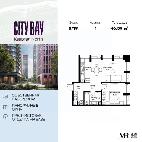 Прямая продажа от застройщика. Продаётся 1-к квартира общей площадью 39.34 м² с предчистовой отделкой в ЖК City Вау, квартале North, на 17-м этаже 26 этажного дома. Концепция жилого комплекса City Вау - настоящий город в городе с отлично развитой инфраструктурой и собственной благоустроенной набережной. На территории жилого комплекса расположено пять кварталов - Atlantic, Pacific, Indian, North, Cliff. Жилой квартал City Вау отличается оригинальной концепцией и выделяется среди других проектов такими характеристиками как: - Архитектура, - Виды из окон, - Природное окружение, вызывая гордость у жителей и восхищение у прохожих. Вся жизнь района Покровское-Стрешнево строится вокруг водных объектов: - Пойма реки Сходни с уникальной экосистемой, - Речка Химка и Химкинское водохранилище, - Москва-река, - Канал имени Москвы. Кругом вода, и местные с удовольствием этим пользуются. А сразу за рекой - центр водного спорта в Строгино с вейк-парком и яхт-клубами. Помимо воды, здесь очень много зелени: - Рядом Сходненский ковш памятник природы, естественный амфитеатр глубиной 40 метров; - Парк при усадьбе Братцево с фруктовым садом; - Дубовая роща "Маяк", - Алешкинский лес; - Лесопарк Покровское-Стрешнево с пляжами и бобрами. Главные транспортные артерии района: - Волоколамское шоссе, - Таганско-Краснопресненская линия метро и МЦД-2. Всего за 20 минут можно добраться до центра на машине или метро, а МЦД связывает ЖК City Вау с северными, восточными и юго-восточными районами. Компания MR Group предлагает своим клиентам специальные условия приобретения квартир в рамках программ ипотечного кредитования от банков-партнеров. 1-комнатная квартира от застройщика на шоссе Волоколамское в Москве.