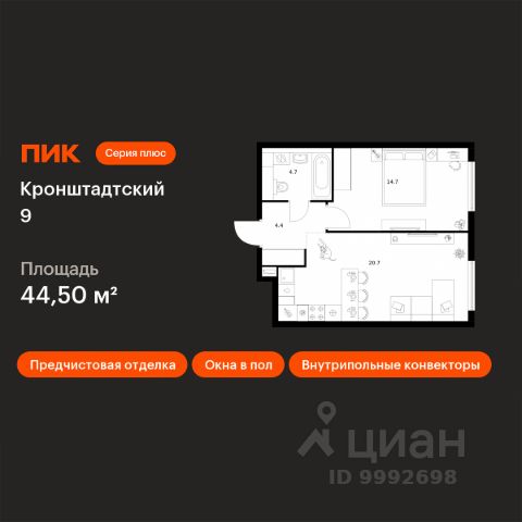 Продаётся 1-комн. квартира площадью 46,3 кв.м на 4 этаже 12 этажного дома (Корпус 1.1.2, Секция 2) проекта ПИК Кронштадтский 9. Светлый просторный подъезд на уровне земли, функциональная планировка, большие окна, предчистовая отделка. Жилой квартал "Кронштадтский 9" возводится в Головинском — в одном из районов с лучшей экологией в Москве. Совсем рядом станция метро "Водный стадион" — до неё 3 минуты пешком. Поездка на машине до Ленинградского шоссе займёт 2 минуты, до ТТК — 10 минут, а до МКАД — 16 минут. Недалеко от жилого квартала находятся парки и пруды — спокойные места для прогулок и отдыха. В "Кронштадтском 9" можно купить квартиру в уже готовом корпусе и сразу получить ключи. В проект входит 10 корпусов с просторными и светлыми подъездами, два детских сада и подземный паркинг. Внутри квартала будут уютные дворы-парки с детскими площадками и местами для отдыха. А чуть дальше, чтобы шум не беспокоил жителей домов, мы построим спортивные площадки. Во всех квартирах в этом проекте предчистовая отделка, с которой легче реализовать ваши дизайнерские идеи. В районе, где строится "Кронштадтский 9", есть всё для комфортной жизни: школы, сады, вузы, магазины и крупные торговые центры "Водный" и "Метрополис". В 15 минутах ходьбы — парк у Головинских прудов, в 18 минутах — парк "Дружба". Оба для прогулок, пробежек и отдыха от дома и работы. Ключевая особенность новых корпусов проекта — это особый архитектурный образ, разработанный бюро М.А.М. Здания привлекают внимание контрастом светлых фасадных поверхностей с тёмными, более детализированными элементами. Архитектурные приёмы формируют связь с городским контекстом: низкоэтажные корпуса естественно вписываются в окружающий ландшафт, в то время как 32-этажная башня добавляет вертикальный акцент, усиливающий общий облик квартала. В "Кронштадтском 9" умные планировки: вы сами выбираете, как их использовать, чтобы ваша квартира была максимально комфортной именно для вас. Например, постирочная может стать студией звукозаписи, а зона для гардероба — кабинетом. В новых корпусах есть квартиры с кухней-нишей, сквозным санузлом и мастер-спальней с собственной ванной. Квартиры продаются с предчистовой отделкой. Это значит, что к моменту получения ключей в доме уже закончатся самые грязные и шумные работы, а вам будет легче реализовать дизайнерские идеи. Рядом с проектом есть всё необходимое. В паре минут пешком — торговые центры "Гавань" и "Водный", а в 7 минутах на машине — большой ТРЦ "Флотилия". В шаговой доступности аптеки и детская городская поликлиника. Доехать до взрослой поликлиники можно за несколько минут. Вокруг несколько интересных мест для прогулок, в том числе с детьми. Можно арендовать лодку или просто понаблюдать за плывущими яхтами и парусниками на Северном речном вокзале, побродить по парку возле усадьбы Грачёвки или сходить в музей охоты и рыболовства. Артикул 967417 (Застройщик АО "Специализированный застройщик МАК8") 1-комнатная квартира с отделкой в районе Головинский в Москве.