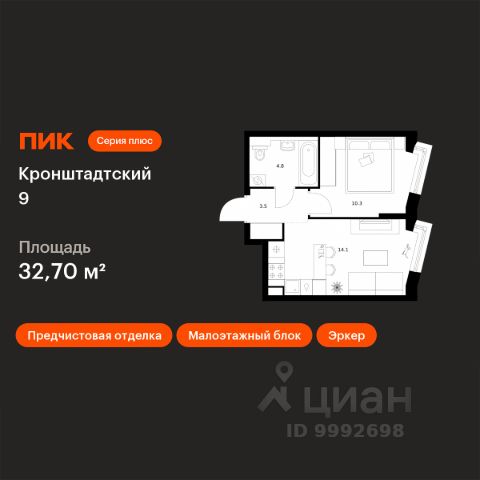 Продаётся 1-комн. квартира площадью 32,7 кв.м на 3 этаже 12 этажного дома (Корпус 1.1.2, Секция 2) проекта ПИК Кронштадтский 9. Светлый просторный подъезд на уровне земли, функциональная планировка, большие окна, предчистовая отделка. Жилой квартал "Кронштадтский 9" возводится в Головинском — в одном из районов с лучшей экологией в Москве. Совсем рядом станция метро "Водный стадион" — до неё 3 минуты пешком. Поездка на машине до Ленинградского шоссе займёт 2 минуты, до ТТК — 10 минут, а до МКАД — 16 минут. Недалеко от жилого квартала находятся парки и пруды — спокойные места для прогулок и отдыха. В "Кронштадтском 9" можно купить квартиру в уже готовом корпусе и сразу получить ключи. В проект входит 10 корпусов с просторными и светлыми подъездами, два детских сада и подземный паркинг. Внутри квартала будут уютные дворы-парки с детскими площадками и местами для отдыха. А чуть дальше, чтобы шум не беспокоил жителей домов, мы построим спортивные площадки. Во всех квартирах в этом проекте предчистовая отделка, с которой легче реализовать ваши дизайнерские идеи. В районе, где строится "Кронштадтский 9", есть всё для комфортной жизни: школы, сады, вузы, магазины и крупные торговые центры "Водный" и "Метрополис". В 15 минутах ходьбы — парк у Головинских прудов, в 18 минутах — парк "Дружба". Оба для прогулок, пробежек и отдыха от дома и работы. Ключевая особенность новых корпусов проекта — это особый архитектурный образ, разработанный бюро М.А.М. Здания привлекают внимание контрастом светлых фасадных поверхностей с тёмными, более детализированными элементами. Архитектурные приёмы формируют связь с городским контекстом: низкоэтажные корпуса естественно вписываются в окружающий ландшафт, в то время как 32-этажная башня добавляет вертикальный акцент, усиливающий общий облик квартала. В "Кронштадтском 9" умные планировки: вы сами выбираете, как их использовать, чтобы ваша квартира была максимально комфортной именно для вас. Например, постирочная может стать студией звукозаписи, а зона для гардероба — кабинетом. В новых корпусах есть квартиры с кухней-нишей, сквозным санузлом и мастер-спальней с собственной ванной. Квартиры продаются с предчистовой отделкой. Это значит, что к моменту получения ключей в доме уже закончатся самые грязные и шумные работы, а вам будет легче реализовать дизайнерские идеи. Рядом с проектом есть всё необходимое. В паре минут пешком — торговые центры "Гавань" и "Водный", а в 7 минутах на машине — большой ТРЦ "Флотилия". В шаговой доступности аптеки и детская городская поликлиника. Доехать до взрослой поликлиники можно за несколько минут. Вокруг несколько интересных мест для прогулок, в том числе с детьми. Можно арендовать лодку или просто понаблюдать за плывущими яхтами и парусниками на Северном речном вокзале, побродить по парку возле усадьбы Грачёвки или сходить в музей охоты и рыболовства. Артикул 967406 (Застройщик АО "Специализированный застройщик МАК8") 1-комнатная квартира с отделкой в районе Головинский в Москве.