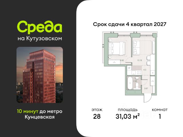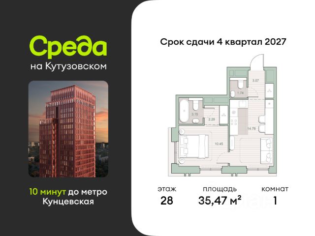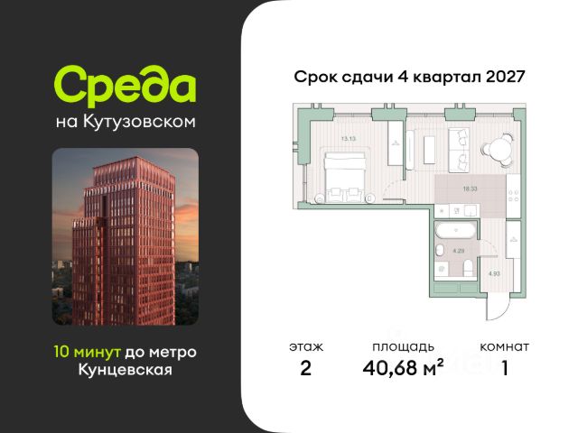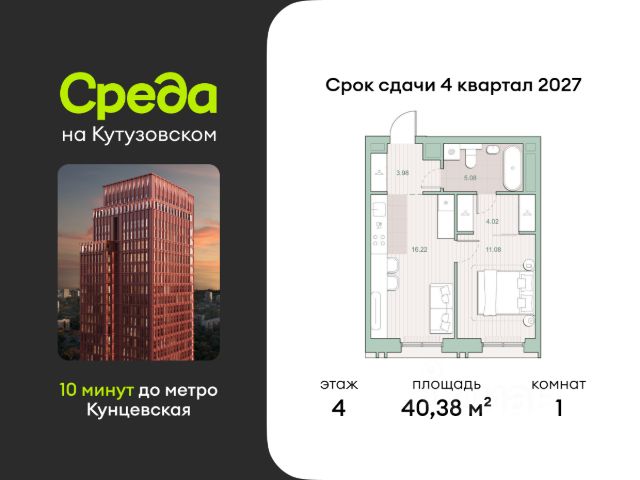 О квартире Продаётся однокомнатная квартира общей площадью 40.38 кв. м. с отделкой на выбор: черновая, White Box. Квартира на 4 этаже корпуса 5 в жилом комплексе бизнес-класса "Среда на Кутузовском". До метро "Кунцевская" 10 минут пешком. Исторический зелёный район "Среда на Кутузовском" строится в Кунцево - историческом и экологически чистом районе Москвы. Здесь нет крупных производств, много лесных массивов и роза ветров, которая обеспечивает приток чистого воздуха. Район наполнен жизнью и уже развит: много детских садов и школ, поликлиники, магазины, кафе, спортивные объекты, парки. - 10 минут пешком до станции метро "Кунцевская". - 5-8 минут на машине до Кутузовского проспекта и Можайского шоссе и 10-15 минут до Рублёвского и МКАД. - 15 минут езды до Крылатских холмов, Суворовского парка и заказника "Долина реки Сетунь". Акции и спецпредложения - Выгода 12%: если внести 100% оплату или оформить семейную ипотеку под 6%. Действует до 13 апреля. - Низкие ставки по ипотеке: 0,1% в первый год или 0,11% в первые два года кредита. - Трейд-ин от "Среды": можно обменять свою текущую квартиру на новую. - Ипотека для семей с детьми: если ребёнку до 7 лет, предлагаем льготную ставку 3,5% О жилом комплексе "Среда на Кутузовском" - новый квартал с башнями от 12 до 44 этажей, окружённый лесными массивами и историческими усадьбами старой Москвы. Во внутреннем дворе есть водоём, многоуровневые зоны с детскими и спортивными площадками, коворкинг на свежем воздухе и локации для уединённого отдыха. Особенности - Архитектура с многослойными фасадами. - Квартиры с террасами и мастер-спальнями. - Окна в пол на всех этажах. - Общественные лаунж-гостиные. - Собственный ландшафтный парк во дворе. - Зоны барбекю и площадки для отдыха у воды. - Умный подземный паркинг. - Стрит-ритейл на первых этажах.