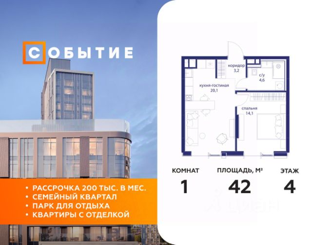 В продаже 1-к квартира от застройщика. Общая площадь 42.00, жилая 14.10, кухня 20.1. Квартира расположена на 4 этаже жилого квартала "Событие-6", корпус 1, Секция 3. Квартира с чистовой отделкой. Срок сдачи: 4 кв. 2029 года. СОБЫТИЕ.6 — финальный дом парк-квартала СОБЫТИЕ на Мосфильмовской. Переезжайте в уже сформированный квартал с готовой инфраструктурой и парком! Премиальный жилой комплекс в престижном районе Москвы предлагает стильную архитектуру, продуманное благоустройство и великолепно разнообразие общественных пространств. Свой парк прямо возле дома! Архитектура Архитектура СОБЫТИЯ.6 выполнена в ультрасовременном стиле московским бюро Atrium на основе дизайн-кода британских архитекторов LDA Design и UHA London. Дом отличает оригинальная геометрия фасадов, большое остекление и высокие лобби (до 6,2 м) с авторской мебелью и светильниками. Расположение Мосфильмовская улица (Раменки) — один из престижных районов Москвы. Близость к историческому и деловому центру, природным зонам Запада столицы. Транспортная доступность: • 10 мин до Москва-Сити и ТТК; • 15 мин до Садового кольца; • 25 мин до аэропорта Внуково; • 7-10 мин до станций метро "Аминьевская" и "Мичуринский проспект". Инфраструктура: • парк "Событие" (12 га, финалист конкурса Правительства Москвы) с беговыми (1,5 км) и велодорожками (2,7 км), экотропой (1,6 км), площадками, лекторием; • школа, детский сад, магазины, салоны красоты, рестораны (к моменту заселения); • мультидвор с игровыми и спортивными площадками, мини-бульваром; • общественная терраса на 10-м этаже (коворкинг, лаунж); • Закрытые общественные пространства: детская комната, спортивный зал, коворкинг, лаунж-зоны. Паркинг 256 мест для жителей (48 — для электромобилей), 24 гостевых (5 — для электромобилей), мойки колес, кладовые, зоны для велосипедов. Окружение Парки и заповедники (Воробьёвы горы, Матвеевский лес и др.), МГУ, театр им. Н. И. Сац, стадион "Лужники". Безопасность Видеонаблюдение, контроль доступа, видеодомофоны, консьерж-сервис 24/7, системы пожарной безопасности и мультисервисная оптическая сеть.