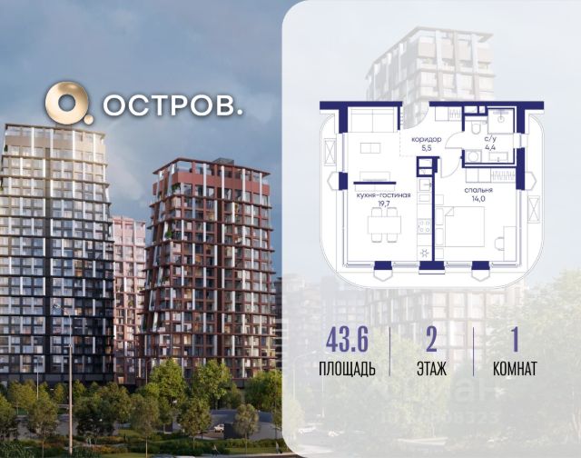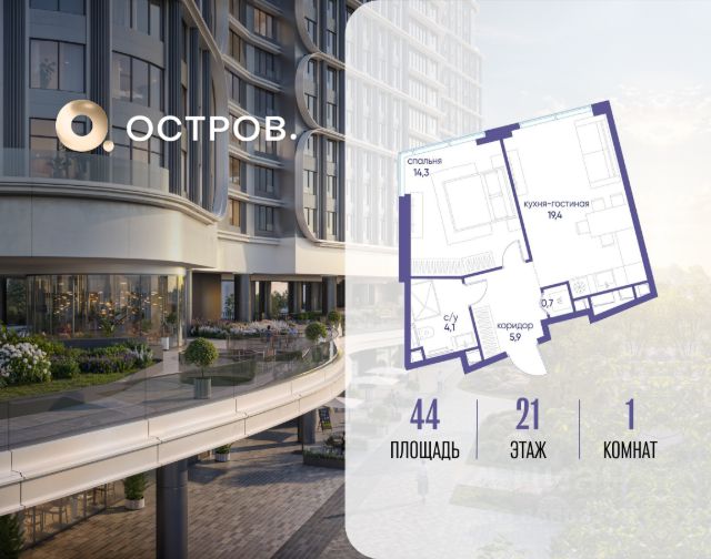 Продаётся однокомнатная квартира от застройщика: общая площадь 44.00 м², жилая 14.30 м², кухня 19.40 м², 21, жилой квартал "Остров 7", корпус 7 (7 квартал) (секция 1). срок сдачи: 4-кв. 2025. , 1 совмещенный санузел. В жилой зоне 2 больших окна на одну сторону, хорошая инсоляция. Позвоните сейчас и забронируйте квартиру! Купите квартиру в доме у прибрежного парка, в квартале ОСТРОВ.7. Это семь корпусов премиум- и бизнес-класса в одном из лучших мест ОСТРОВА - между бульваром и парком, поблизости от реки. Стильные корпуса имеют узнаваемый вид благодаря бионической пластике фасадов, приподнятых над землей. Для жителей предусмотрены детский клуб, фитнес-рум, коворкинг, переговорные, лаунжи. На крышах устроены видовые общественные пространства с зонами для отдыха и спорта. Двор расположен на двух уровнях: нижний ландшафтный парк и верхняя городская терраса. ОСТРОВ.7 - часть жилого комплекса на западе Москвы, в 15 минутах езды от центра. Это настоящий заповедник посреди большого города, в окружении реки и 650 га заповедников. Здесь все необходимое находится по соседству: от детского сада до супермаркета, от фитнес-зала до серфинг-центра. На территории созданы все условия для отдыха и общения: клубная инфраструктура в домах и дворы-парки, набережные и променады, маршруты для спортсменов, детей и возрастных жителей. В нескольких минутах ходьбы расположена станция метро "Терехово" БКЛ. На автомобиле - 10 минут до Москва-Сити и 15 минут до Садового кольца.
