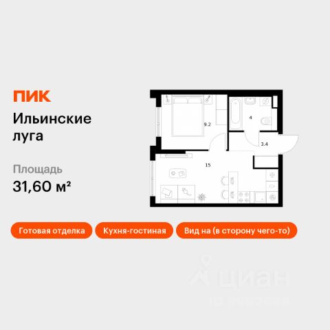 Продаётся 1-комн. квартира площадью 31,6 кв.м на 9 этаже 9 этажного дома (Корпус 3.3, Секция 3) проекта ПИК Ильинские луга. Светлый просторный подъезд на уровне земли, функциональная планировка, большие окна, c отделкой. Жилой район "Ильинские луга" находится в 10 километрах от МКАД по Новорижскому шоссе, в 20 минутах на автомобиле от станций метро "Волоколамская", "Тушинская" и "Строгино". В будущем ближе к проекту, в 9 минутах пути на машине, откроется станция "Ильинская" Рублёво-Архангельской линии, которая будет соединять Арбатско-Покровскую линию и Большую кольцевую линию. Сейчас в квартале начались продажи в корпусах 3.2, 3.3, 3.4, 3.5 и 3.6. "Ильинские луга" — масштабный проект, в который входит девять детских садов, четыре школы и поликлиника. Он строится в престижном и экологичном районе среди лесов и памятников природы. За 5 минут от жилого квартала можно доехать до Рублёво-Успенского шоссе, а за 30 минут — до центра Москвы. До крупного торгового центра "РИГАМОЛЛ" всего 5 минут на автомобиле, а до ТЦ "Твой дом" и гипермаркета "Глобус" — 10 минут. В "Ильинских лугах" строятся только девятиэтажные дома — такая архитектура соответствует спокойной жизни за городом. В каждом дворе-парке есть места для отдыха, детские и спортивные площадки. А ещё, здесь уже открыт большой PlayHub "Гравити" — современное игровое пространство с космической тематикой, холмами, зонами для игр и отдыха жителей любого возраста. На первых этажах уже работают магазины, кафе и пекарни. Места для отдыха от "Ильинских лугов" тоже недалеко: 10 минут на машине — и вы в музее-усадьбе "Архангельское". Также рядом находится Лохин остров — памятник природы, где водятся речные черепахи, есть места для кемпинга и возможность сплавиться по реке. Артикул 994065 (Застройщик ООО "СЗ "ГРАДОЛИМП")