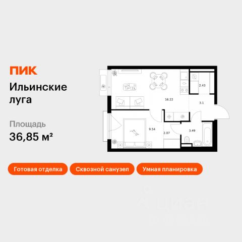 . • Предлагается однокомнатная квартира в жилом комплексе Ильинские Луга. Здесь всё про Вас и Ваши мечты! • Свободная продажа, 1 собственник, основание ДДУ (срок сдачи до 30.09.2027 года). • Квартира сдаётся с отделкой на условиях, прописанных в приложении к ДДУ. Окнами во двор. • Общая площадь квартиры 34,4 м², жилая 10,1 м², кухня 16,8 м², санузел совмещённый, окнами во двор, балкон, на 7-ом этаже. • Квартира сдаётся с отделкой на условиях, прописанных в приложении к ДДУ. • Жилой район Ильинские луга находится в 10 километрах от МКАД по Новорижскому шоссе, в 20 минутах на автомобиле от станций метро Волоколамская, Тушинская и Строгино. В 2027 году откроется станция метро Новорижская (от дома 9 минут на машине). • Входы в подъезды расположены на уровне земли, широкий и зелёный пешеходный бульвар, три детских сада и школа. Дома здесь средней высоты, девятиэтажные, поэтому в квартирах и во дворах много солнечного света. • Гулять, отдыхать, играть и заниматься спортом в Ильинских лугах можно рядом с домом, купить продукты или позавтракать — так же: на первых этажах домов откроются магазины и кафе. Рядом с Ильинскими лугами три парка: за 10-15 минут можно доехать до музея-усадьбы Архангельское, заповедника Лохин остров и Москвы-реки.