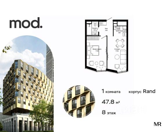 Прямая продажа от застройщика. Дизайнерская отделка MR Ready. Продается 1-комнатная квартира общей площадью 44.16 м² с чистовой отделкой в ЖК Mod на 4-м этаже 9 этажного клубного дома. Mod - жилой комплекс премиум-класса в историческом районе Москвы Марьина Роща, состоящий из трех клубных домов (9 этажей) и трёх разноэтажных башен (44-55 этажей). Корпус Mod.S (9 этажей) В отделке клубного дома используется бронза, алюминий и камень. Благодаря сложной архитектуре и грамотному смешению материалов рождается неповторимый динамичный ансамбль. Закрытая территория жилого комплекса, продуманное благоустройство, эксплуатируемые кровли стилобата, образовательный центр с детским садом создают приватное пространство для тихой семейной жизни, а городская площадь с фонтанами, ресторан, супермаркет, коммерческая инфраструктура на первых этажах привносят созвучную с ритмом города динамику. Преимущества проекта: - В шаговой доступности новый деловой кластер Москвы - Выразительная авторская архитектура - Единственные в Москве фасады башен из натурального камня - Панорамное остекление и высота потолков до 4,8 м - Квартиры и апартаменты с отделкой MR Base - Многоуровневое благоустройство с зонированием на закрытой территории - Многофункциональный образовательный детский центр с детским садом - Двухуровневый подземный паркинг Транспортная доступность: - 5 минут пешком до станции метро "Марьина Роща" - 3 минуты до ТТК - 15 минут до Цветного бульвара Компания MR предлагает своим клиентам специальные условия приобретения квартир в рамках программ ипотечного кредитования от банков-партнеров. Продается 1-комнатная квартира с отделкой рядом с метро Рижская.