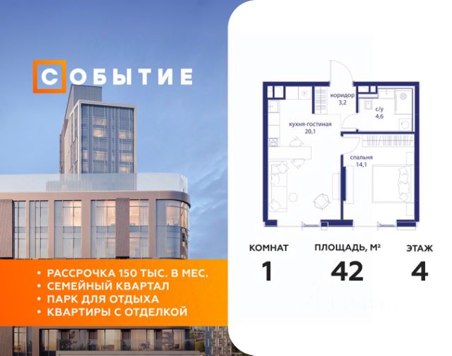 В продаже 1-к квартира от застройщика. Общая площадь 39.00, жилая 14.50, кухня 16.6. Квартира расположена на 9 этаже жилого квартала "Событие-6", корпус 1, Секция 3. Квартира с чистовой отделкой. Срок сдачи: 4 кв. 2029 года. СОБЫТИЕ.6 — финальный дом парк-квартала СОБЫТИЕ на Мосфильмовской. Переезжайте в уже сформированный квартал с готовой инфраструктурой и парком! Премиальный жилой комплекс в престижном районе Москвы предлагает стильную архитектуру, продуманное благоустройство и великолепно разнообразие общественных пространств. Свой парк прямо возле дома! Архитектура Архитектура СОБЫТИЯ.6 выполнена в ультрасовременном стиле московским бюро Atrium на основе дизайн-кода британских архитекторов LDA Design и UHA London. Дом отличает оригинальная геометрия фасадов, большое остекление и высокие лобби (до 6,2 м) с авторской мебелью и светильниками. Расположение Мосфильмовская улица (Раменки) — один из престижных районов Москвы. Близость к историческому и деловому центру, природным зонам Запада столицы. Транспортная доступность: • 10 мин до Москва-Сити и ТТК; • 15 мин до Садового кольца; • 25 мин до аэропорта Внуково; • 7-10 мин до станций метро "Аминьевская" и "Мичуринский проспект". Инфраструктура: • парк "Событие" (12 га, финалист конкурса Правительства Москвы) с беговыми (1,5 км) и велодорожками (2,7 км), экотропой (1,6 км), площадками, лекторием; • школа, детский сад, магазины, салоны красоты, рестораны (к моменту заселения); • мультидвор с игровыми и спортивными площадками, мини-бульваром; • общественная терраса на 10-м этаже (коворкинг, лаунж); • Закрытые общественные пространства: детская комната, спортивный зал, коворкинг, лаунж-зоны. Паркинг 256 мест для жителей (48 — для электромобилей), 24 гостевых (5 — для электромобилей), мойки колес, кладовые, зоны для велосипедов. Окружение Парки и заповедники (Воробьёвы горы, Матвеевский лес и др.), МГУ, театр им. Н. И. Сац, стадион "Лужники". Безопасность Видеонаблюдение, контроль доступа, видеодомофоны, консьерж-сервис 24/7, системы пожарной безопасности и мультисервисная оптическая сеть. Продается 1-комнатная квартира с отделкой в районе Раменки в Москве.