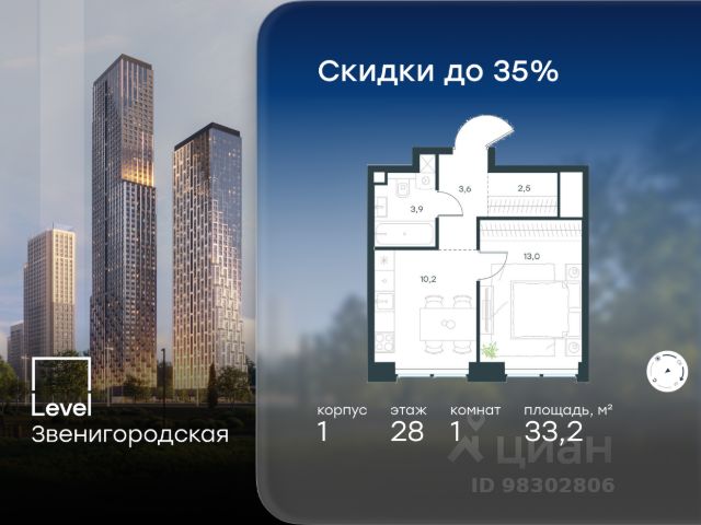 10 минут от Москва-Сити В продаже квартира площадью 45.64 м² с предчистовой отделкой на 42 этаже 55 этажного дома. Квартира расположена в корпусе Anna. JOIS это премиальный жилой комплекс от девелопера MR в районе Хорошёво-Мнёвники. Он включает несколько эффектных небоскрёбов высотой 47-56 этажей, эксклюзивные форматы квартир с панорамным остеклением, подземный двухуровневый паркинг на 239 м/м, собственную приватную инфраструктуру, закрытый ландшафтный парк 2,3 Га с функциональным зонированием и охраняемой территорией. Над проектом работали лучшие команды международных агентств с многолетним опытом: Genpro, S&P, iLight International и другие. Расположение Пешком: - 5 мин. ст. МЦК "Хорошёво"; - 15 мин. ст. м. "Народное ополчение"; - 10 мин. ст. метро "Звенигородская" с 2027 года; - 20 мин. причал "Карамышевский". На автомобиле: - 3 мин. до Звенигородского шоссе; - 5 мин. до ТТК: - 8 мин. до Серебряного бора и Строгинского затона - 10 мин. до ММДЦ "Москва-Сити"; - 40 мин. до аэропорта "Шереметьево"; Благоустройство - собственный ландшафтный парк 2,3 Га; - парк скульптур от Cosmoscow; - консьерж-сервис 24/7; - сервисный лифт и вход; - игровые и спортивные площадки; - коворкинг с библиотекой; - лаунж-зона с камином; - игровые комнаты для детей и клуб для подростков с оборудованием для видеоигр; - спортивная студия для индивидуальных тренировок; - гостиная с мини-кухней; - зоны для выгула собак; - подогрев пешеходных дорожек в зимний период; - автополив зелёных насаждений; - премиальные рестораны, кафе, химчистки, аптеки и супермаркеты. Окружение - 4 парка: Покровское-Стрешнево, Филёвский парк, Серебряный бор и Берёзовая роща; - 15 общеобразовательных заведений, в том числе две школы из самых лучших в Москве: государственная школа "Интеграл" и частная "Хорошкола"; - спортивное сооружение "ВЭБ Арена", домашний стадион ФК ЦСКА; - крупнейший в Европе торгово-развлекательный центр "Авиапарк". Купить 1-комнатную квартиру с отделкой станция Хорошево (МЦК).