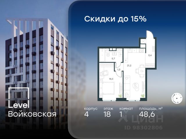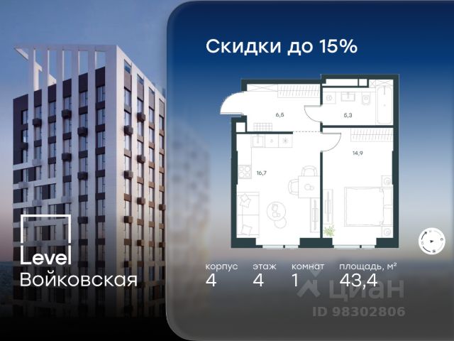 Цена указана с учётом скидки при 100%-й оплате, несубсидированной ипотеке, рассрочке (кроме программы "Рассрочка 0%"). Продается 1-комнатная квартира площадью 40.90 кв. м с отделкой. Квартира находится на 4 этаже 26-этажного корпуса 4, в новом жилом комплексе бизнес-класса Level Войковская, расположенном рядом с живописным заповедником "Покровское-Стрешнево" (застройщик - компания Level Group/Левел групп). Прекрасная транспортная доступность - 7 мин. пешком до станции МЦК "Балтийская"; - 15 мин. пешком до станции метро "Войковская"; - 8 мин. на машине до ТТК; - 15 мин. на машине до центра Москвы; - 20 мин. на машине до Москва-Сити. Продуманный архитектурный проект - стильная архитектура от мастерской Фефелова В. В.; - панорамные виды на парки, Химкинское водохранилище и Останкинскую башню; - лобби с высотой потолков до 6,45 метров; - более 20 видов планировочных решений, включая редкие форматы квартир с террасой и увеличенной высотой потолков до 5,42 метров; - 2 варианта дизайнерской отделки в корпусе 4, предлагаются как дополнительная опция к отделке white box: стиль Modern в светлых холодных тонах и стиль Classic в нейтральной бежевой гамме. Квартиры в корпусах 3 и 5 сдаются без отделки. Расположение Level Войковская строится в престижном Северном округе Москвы. Развитая инфраструктура и живописная природа переплетаются в единый ансамбль, столь значимый для комфортной жизни. Войковский район окружают парки и набережные. В шаговой доступности - парк "Покровское-Стрешнево", не более 15-ти минут на велосипеде занимает путь до Тимирязевского парка и 9-ти минут до парка усадьбы Михалково. Рядом более 60 школ, 75 дошкольных учреждений, 17 государственных и 6 частных вузов, 25 супермаркетов, 4 торговых центра, среди которых ТЦ "Метрополис" и ТЦ "Авиапарк". Внутренняя инфраструктура На территории жилого комплекса предусмотрены коммерческие помещения: кафе, ресторан, пекарня и другие сервисы откроются на первых этажах корпусов. Для жителей будет доступен отапливаемый подземный паркинг на 244 машино-места с доступом с любого этажа на лифте. На территории паркинга будет расположено 125 кладовых помещений для хранения сезонного инвентаря. Лобби и благоустройство Дизайн лобби Level Войковская создан совместно с бюро BLANK. Это уютные гостиные, где хочется задержаться. Теплая цветовая гамма, ресепшен, зоны ожидания, лапомойки и гостевые санузлы - каждая деталь превращает лобби в комфортное продолжение вашего дома. 1,15 га площади в первых двух этапах строительства отведено под приватный внутренний двор, который спроектирован совместно с бюро "Правда". Детские площадки для всех возрастов, спортивные пространства для йоги, воркаута и петанка, уютные зоны для тихого отдыха или работы. Здесь утро начинается с вдохновения, а вечер наполнен приятными моментами. Лифты Комфортное перемещение внутри жилого комплекса будут обеспечивать надёжные лифты с доступом в паркинг с жилых этажей. В каждом корпусе предусмотрено по 3 грузопассажирских лифта.