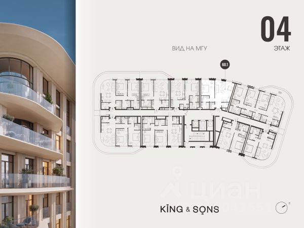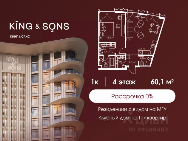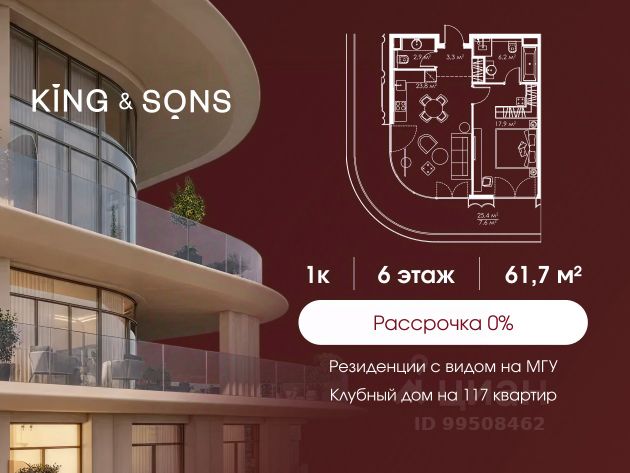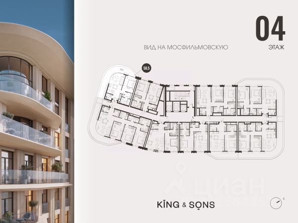 КИНГ энд САНС это клубный дом на 117 резиденций премиум-класса, расположенный на престижной и исторической улице Мосфильмовская. Из большинства квартир открываются панорамные виды на МГУ, "Москву-Сити", особняки посольств и парки. Это место для тех, кто не хочет выбирать между комфортом мегаполиса и уединением на природе. Проект разработан международным архитектурным бюро, которое входит в ТОП-2 в мире. Фасады из натурального камня, мягкие формы здания, максимально открытое остекление, окна в пол — все это делает облик здания выразительным и уникальным. В проекте предусмотрено 70% квартир с террасами. Потолки от 3,2 до 4,7 м. Паркинг на 110 машиномест. Для будущих резидентов продуманы разнообразные общественные пространства зимний сад в лобби первого этажа, секретный сад с зоной открытого огня, лаундж-зона с кинотеатром на крыше, собственный спортзал, зоны для занятий йогой и медитацией. КИНГ энд САНС это фамильная недвижимость, которую с гордостью передают по наследству Продается 1-комнатная квартира первичка на улице Мосфильмовская в Москве.