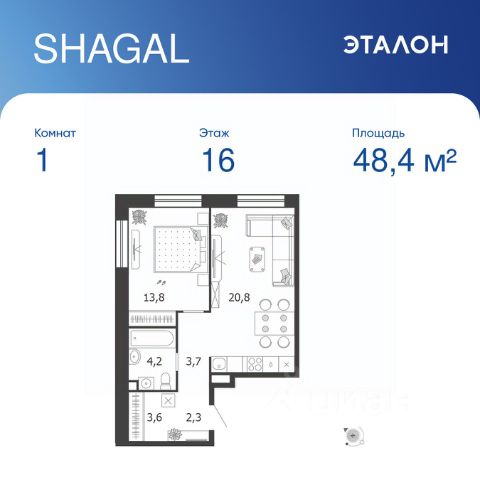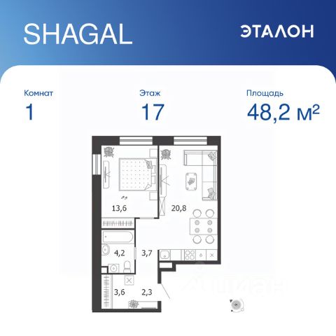 Продается 1-к квартира без отделки в ЖК "Shagal". Общая площадь квартиры — 48.2 кв. м, этаж 17 из 19. Тип дома — монолитный. Цена указана при 100% оплате. Квартал Shagal — крупнейший проект комплексного освоения в Москве. В проекте реализуется продуманная система маршрутов. Еда, покупки, услуги, прогулки, спорт, образование, работа и развлечения — все будет находиться рядом с домом: принцип 15-минутной доступности инфраструктуры и сервисов. Разнообразие и продуманность пешеходных маршрутов, а также короткие расстояния между основными точками притяжения мотивируют резидентов Shagal с удовольствием передвигаться по району пешком, не выпадая из ритма большого города. Продуманная транспортная сеть района и безопасный скоростной режим создают комфортные условия для перемещений любым способом: на автобусе, машине, самокате или велосипеде. Не нужно выезжать из района, чтобы получить комфорт и сервис самого высокого современного стандарта: все необходимые услуги, инфраструктура, парки и вторая по протяженности набережная в городе — на расстоянии 15-минутной прогулки от вашего дома. Квартал Shagal станет первым в Москве жилым районом, где будут комплексно реализованы инновационные подходы в проектировании и строительстве зданий. Архитектурная композиция состоит из домов отличающегося типа. Высотные башни-доминанты с видовыми квартирами, дома пониже, растворяющиеся в спокойствии внутренних двориков, малоэтажные камерные таунхаусы и разноэтажные дома с лоджиями на первой береговой линии соединяются в одно эстетичное современное произведение. В результате создаётся насыщенное идентичное пространство, подчёркнутое плавностью природных форм, наполненное светом, воздухом и свободой.