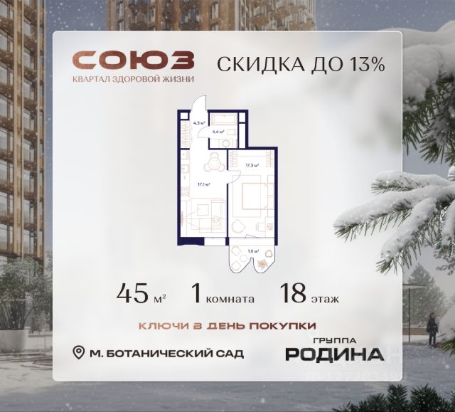 Рассрочка 0% Продаётся 1-комнатная квартира площадью 54.5 м² на 9 этаже в Жилом Комплексе "Союз". Квартал здоровой жизни премиум-класса с рекордным количеством олимпийских видов спорта: - Ледовая арена для хоккея и фигурного катания, - Футбольные поля для тренировок, - Спортивный зал для фехтования, - Бассейн на 6 дорожек, - Центр единоборств, - 4 крытых площадки для настольного тенниса, - 7 теннисных кортов (крытых и открытых), - 4 крытых площадки для сквоша, - Легкоатлетический стадион, - Площадки для баскетбола и волейбола. Уникальные форматы квартир с мастер-спальнями, приватными террасами, балконами, а также пентхаусы с открыточными видами на город. Все квартиры продаются с отделкой Shell&Core и панорамным остеклением. Расположение Пешком: - 2 мин. до парка "Сад Будущего"; - 6 мин. до ст. м. "Ботанический сад"; - 6 мин. до ст. МЦК "Ботанический сад"; - 6 мин. до парка "Леоновская роща"; На автомобиле: - 2 мин. до СВХ (МСД); - 5 мин. до Проспекта Мира; - 10 мин. до ТТК; - 15 мин. до Садового кольца; - 25 мин. до аэропорта "Шереметьево". Благоустройство - собственная спортивная инфраструктура 7 Га; - зона для пикников; - игровые и спортивные площадки для детей всех возрастов; - розарий, а также сосновые, каштановые и дубовые аллеи; - площадки под открытым небом для занятий спортом и йоги; - игровые комнаты для детей; - лаунж-зона для резидентов; - просторная переговорная для деловых встреч; - премиальный ресторан "Шабада" Сосо Павлиашвили с водными арт-объектами на прогулочной аллее, садом ароматных трав и сценой под открытым небом; - кафе, химчистки, аптеки и супермаркеты рядом с домом. Окружение - 8 парков: Сад Будущего, Леоновская роща, Хуамин, Главный ботанический сад РАН, Шереметьевская дубрава, Останкино, парк спорта "Яуза", пойма реки Яуза и музей-усадьба "Останкино"; - 3 ВУЗа: ВГИК, РГСУ, МГПУ; - 12 школ, в том числе: школа 1499 им. И.А. Докукина (топ 100), Brookes Moscow, IThub школа; - 18 детских садов, в том числе билингвальный ALERTUM KIDS; - один из крупнейших океанариумов Европы "Москвариум"; - один из крупнейших в Европе торгово-развлекательных центров "Европолис". Продается 1-комнатная квартира первичка в районе Ростокино в Москве.
