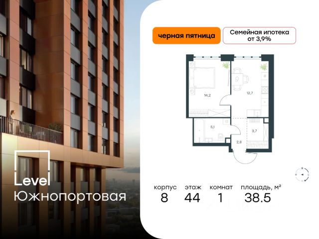 Цена указана с учётом скидки при 100%-й оплате, несубсидированной ипотеке, рассрочке (кроме программы "Рассрочка 0%"). Субсидированная семейная ипотека. Полная стоимость кредита 20,963 - 23,237% годовых. Ставка 3,9% годовых. Первоначальный взнос от 20,01%. Сумма кредита до 12 млн. руб. В северной части района Печатники продается 1-комнатная квартира площадью 35.10 кв.м без отделки. Квартира расположена на 4 этаже 49-этажного корпуса Корпус 8 в жилом комплексе комфорт-класса Level Южнопортовая (компания Level Group/Левел групп). Отличная транспортная доступность: - 10 мин. пешком до станции метро "Кожуховская"; - 20 мин. пешком до станции МЦК "Дубровка"; - 3 мин. на авто до ТТК; - 13 мин. на авто до Садового кольца; - 15 мин. на авто до Бульварного кольца. Продуманный архитектурный проект: - авторская архитектура от бюро СПИЧ; - уникальные виды на реку, парки и достопримечательности города; - высота потолков в квартирах до 6 м; - окна высотой до 1,87 м с высоким коэффициентом сопротивления теплоотдаче. Расположение: Level Южнопортовая строится в северной части района Печатники - самой приближенной к центру. Здесь будет сформирован новый район "Южный порт", где построят крупный жилой и общественно-деловой центр, аналогичный Москва-Сити. В течение 10-12 лет в этом месте появятся не только жилые дома, но и развитая инфраструктура для жизни и работы. А еще совсем рядом находится набережная Москвы-реки, где планируется построить причалы для речных трамвайчиков и канатную дорогу. Уже сейчас вокруг жилого комплекса работают десятки магазинов и торговых центров, рядом расположено 6 парков, среди которых музей-заповедник "Коломенское". В 10 минутах пешком - 2 муниципальных и 2 частных детских сада, 7 общеобразовательных школ. Внутренняя инфраструктура: Для отдыха жителей в каждом корпусе предусмотрено лобби, оснащенное местами для отдыха, гостевыми санузлами и лапомойками, а в отдельных корпусах - камином. За счёт больших окон и высоких потолков пространства будут наполнены воздухом и светом. На первых этажах жилого комплекса откроются кафе, магазины, салоны красоты, фитнес-центр. Для детей строятся собственные детский сад и школа. Благоустройство: Внутренний двор комплекса разработан совместно с бюро GAFA. Основная идея - создать аналог Центрального парка в Нью-Йорке, гармонично сочетая высотные здания и большое изолированное парковое пространство. Вся площадь двора-парка будет огорожена и составит более 2 га, из которых 45% - озеленение. Одним из самых важных ландшафтных элементов здесь станет небольшая речка, наполняющаяся во время дождя. Вокруг неё появится сеть из островов, внутри которых расположатся тематические зоны спорта и отдыха. Технологии и инженерия: - автоматическая передача в управляющую компанию показаний квартирных счётчиков; - телефонная связь, телевидение и интернет на базе оптической мультисервисной сети; - гостевой Wi-Fi в лобби и на территории двора; - единый ключ доступа для входа на территорию комплекса.