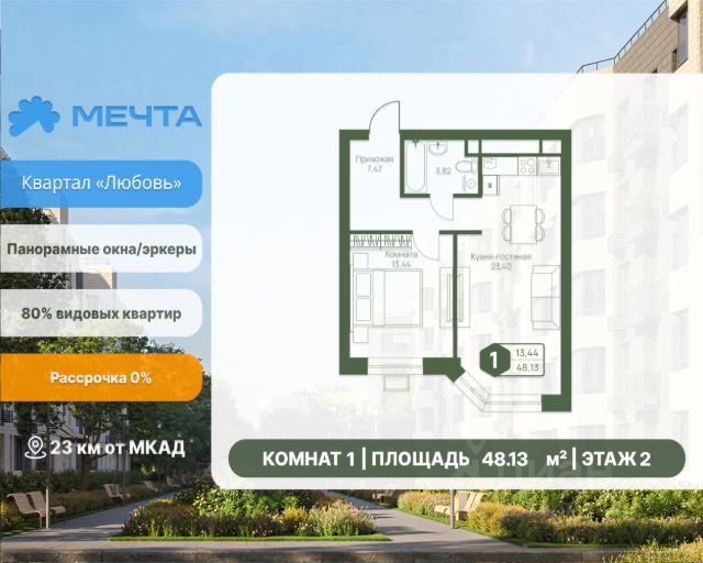 Рассрочка 0% от застройщика! Продается однокомнатная квартира в квартале "Любовь" жилого комплекса "Мечта". Общая площадь квартиры: 37.09 кв. м, этаж 2 из 5. Срок сдачи: 4 квартал 2027 г. Отделка: Чистовая ОСОБЕННОСТИ: - Просторная спальня - Гардеробная - Балкон - Высота потолка: 2.7 метра Квартал "Любовь" — это пять пятиэтажных домов, где продумано действительно всё. Здесь каждая квартира получает больше воздуха и света благодаря панорамным окнам и эркерам. А лифты в малоэтажном доме — большая редкость для Подмосковья, которая делает жизнь комфортнее с первого и до последнего этажа. Просторные мастер-спальни и продуманные планировки — визитная карточка квартала. А из 80% квартир открываются отличные виды: на зелёную зону, центральный парк, природный заказник или реликтовое озеро. В вашем дворе будет собственный детский сад, а в шаговой доступности — образовательный кампус, лес и Парк Мечты. Всё рядом, всё для жизни. Жилой комплекс "Мечта" расположен в 23 км от МКАД по Дмитровскому или Ленинградскому шоссе. ТРАНСПОРТНАЯ ДОСТУПНОСТЬ: - 15-20 минут на общественном транспорте до МЦД-1 "Лобня" - 30-35 минут на общественном транспорте до метро "Физтех" - 45-50 минут до станций метро "Савеловская" или "Белорусская" - 30 минут на автомобиле до Москвы Инфраструктура включает в себя муниципальную школу и детские сады, кабинет врача общей практики, множество кафе и ресторанов, а также различные спортивные и детские площадки. В пешей доступности от жилого комплекса расположены лес и три реликтовых озера — Долгое, Круглое и Нерское, а также реки Альба, Уча и Волгуша. Территория жилого комплекса закрыта для посторонних, находится под охраной и патрулируется. На въезде расположен КПП. Камеры видеонаблюдения работают круглосуточно на всей территории. Вы и ваши дети будете чувствовать себя в безопасности.