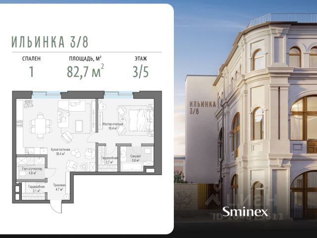"Ильинка 3/8" - cамая близкая к Кремлю и Красной площади коллекция клубных особняков. Дом расположен на месте Тёплых торговых рядов: 160 м до Красной площади, 300 м до Кремля, 500 м до Администрации Президента. Ранее в этой исторической локации проживали представители царских сословий. По соседству находятся одна из старейших в городе Богоявленская церковь и Биржевая площадь. Расположение дарит жителям комфорт и разнообразие: пересечение Ильинки и тихого Богоявленского переулка с минимальным трафиком автомобилей, близость Никольской улицы с её насыщенной инфраструктурой - от топовых бутиков до ресторанов Michelin. "Ильинка 3/8" - это 7 эксклюзивных и роскошных особняков: 3 деликатно реконструированных исторических и 4 новых. В них представлена инфраструктура только для своих: красивый двор-сад с парадной и торжественной входной группой; лобби-бар для встреч, где можно подождать домочадцев, выпить чашечку кофе или взять её с собой; бесплатный фитнес по стандарту инфраструктуры для здорового образа жизни FIT LAB, общественная гостиная по стандарту FRIENDS LAB для знакомства и совместного времяпрепровождения соседей в доме. В клубных особняках представлены самые полные и лучшие в своём классе системы комфорта. О жителях и доме заботится Служба комфорта Smineх, которая предлагает сервис уровня 5-звёздочных отелей и сохраняет изначальный облик и концепцию дома. Девелопер проекта - Sminex, который специализируется на создании комфортной и престижной среды для жизни и работы.
